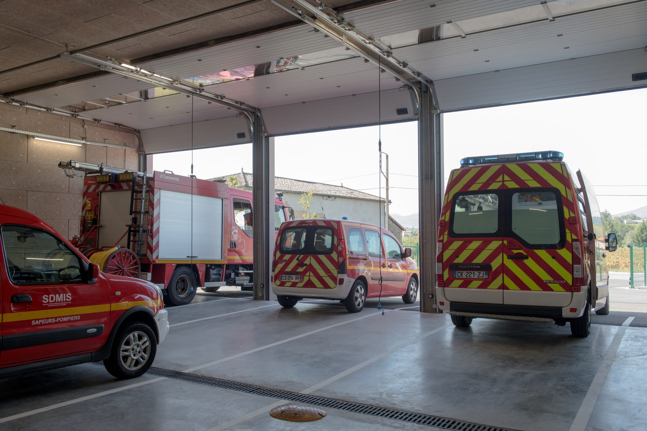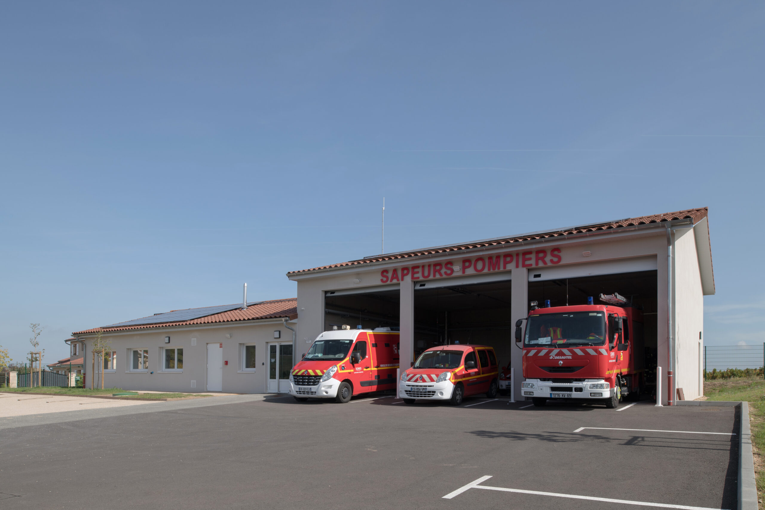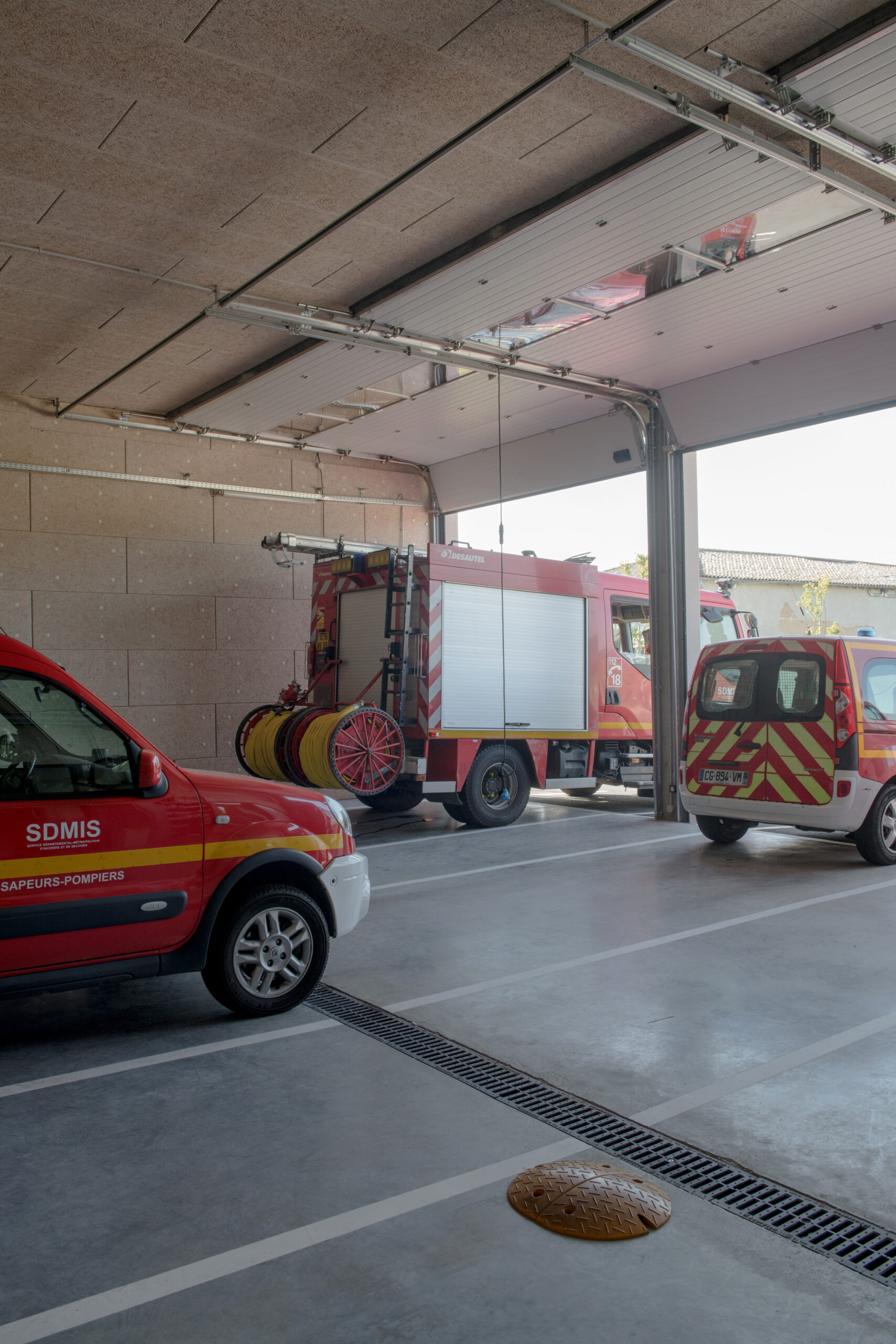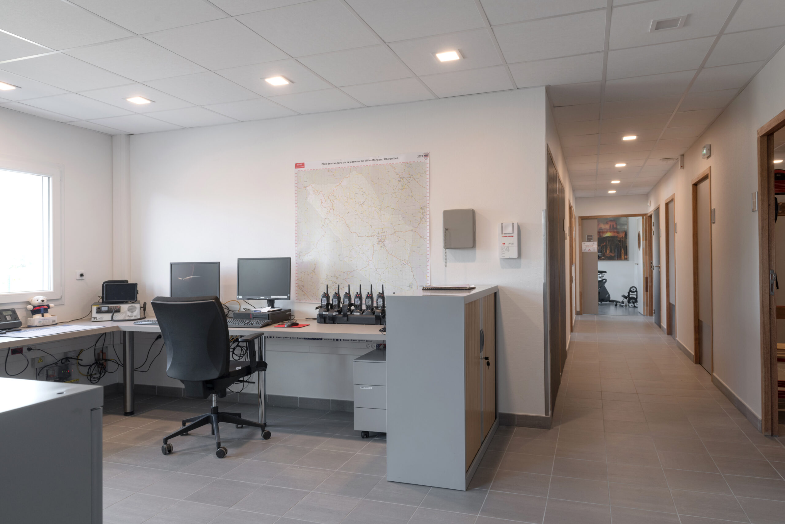 La caserne est composée de deux bâtiments traités distinctement en raison de leurs fonctionnalités : un bâtiment dit “administratif” dont l’entrée accueille le local alerte, épicentre de la caserne, ainsi que le magasin EPI. De ce poste, les sapeurs-pompiers volontaires peuvent agir rapidement dans les différents espaces. Il permet d’être en communication directe avec le hall d’accueil et ainsi d’avoir une vue directe sur le second bâtiment, le hall engins et sur les entr.es et sorties du site.