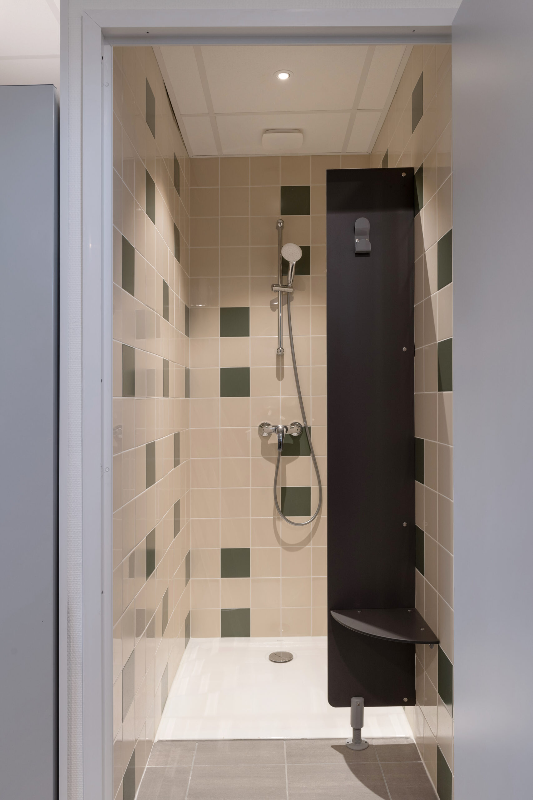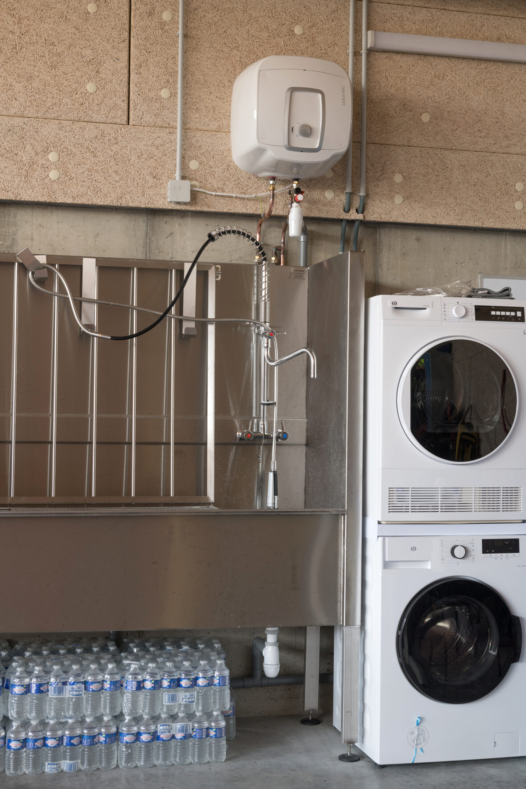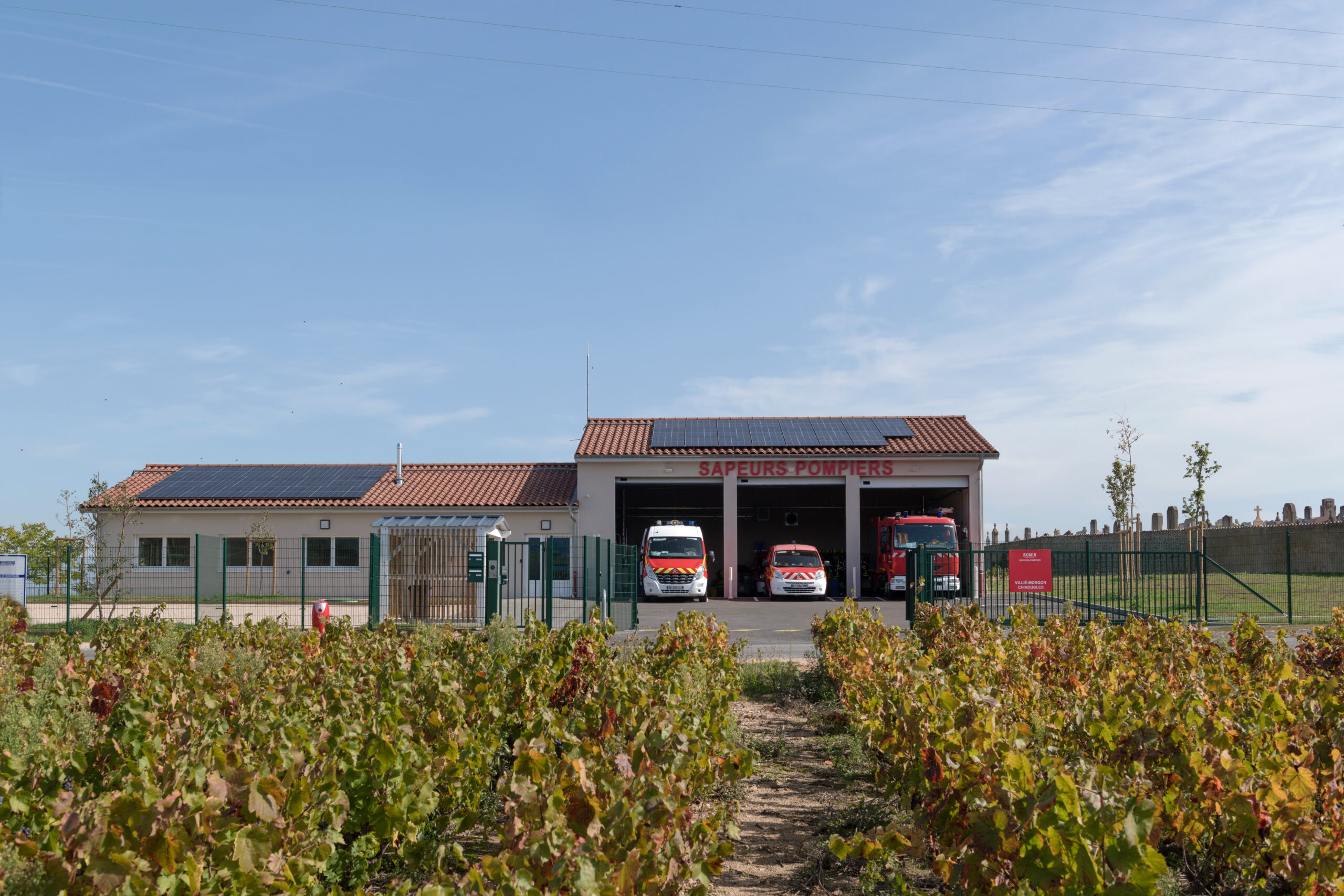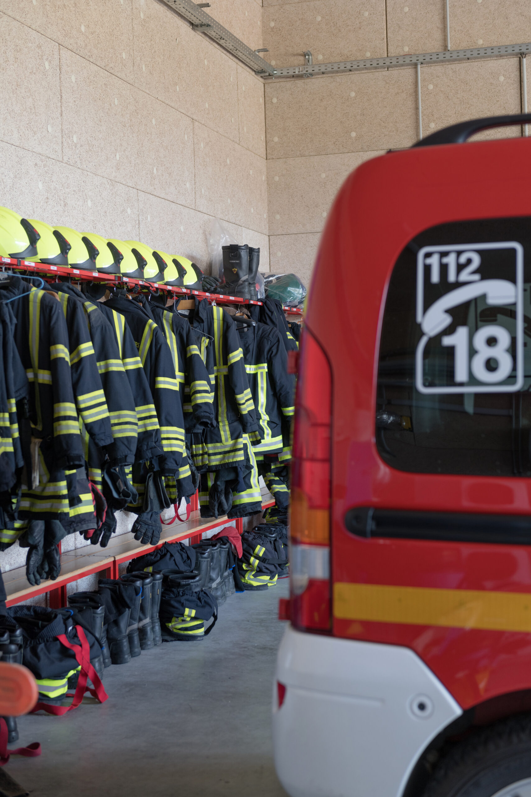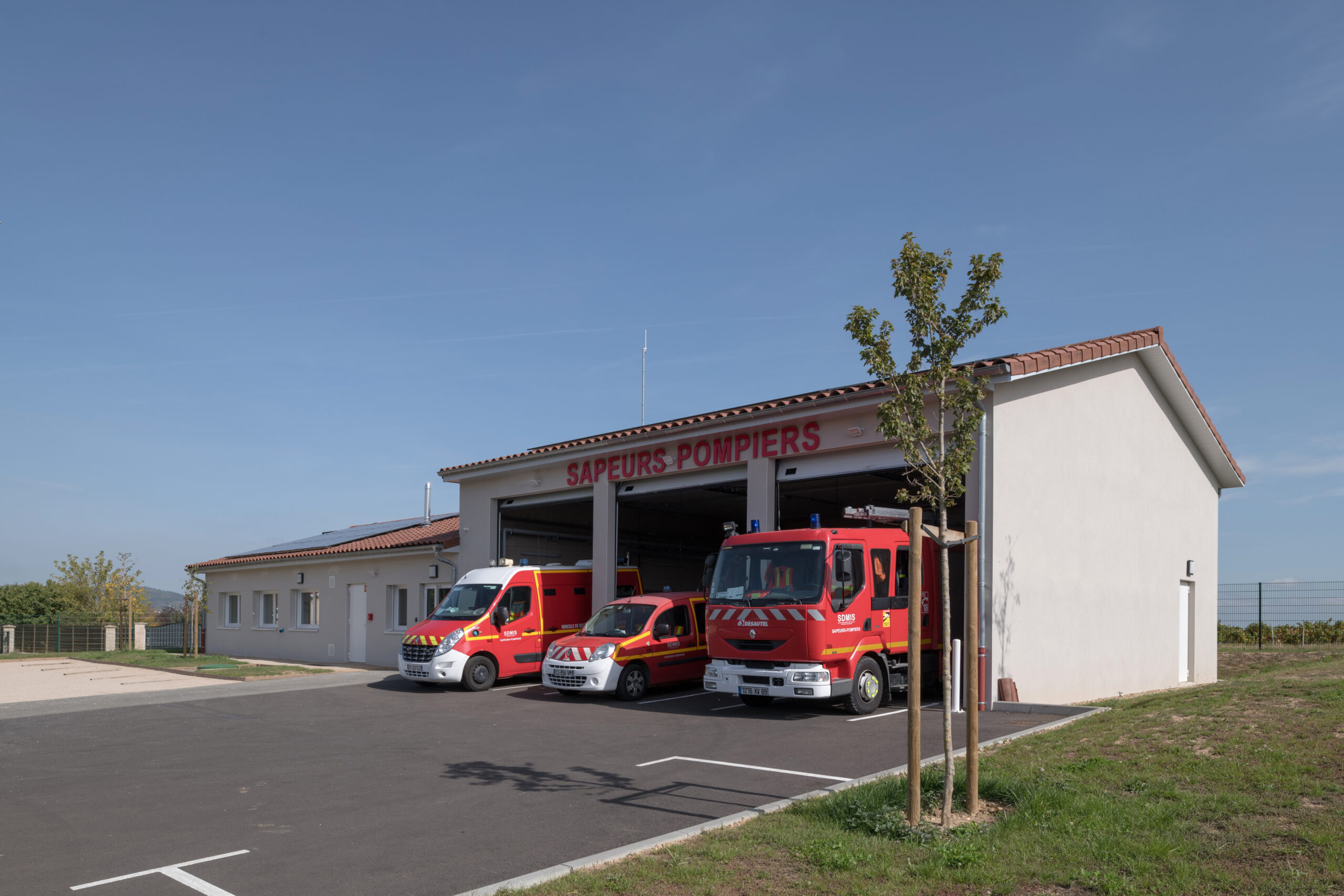 La caserne est composée de deux bâtiments traités distinctement en raison de leurs fonctionnalités : un bâtiment dit “administratif” dont l’entrée accueille le local alerte, épicentre de la caserne, ainsi que le magasin EPI. De ce poste, les sapeurs-pompiers volontaires peuvent agir rapidement dans les différents espaces. Il permet d’être en communication directe avec le hall d’accueil et ainsi d’avoir une vue directe sur le second bâtiment, le hall engins et sur les entr.es et sorties du site.