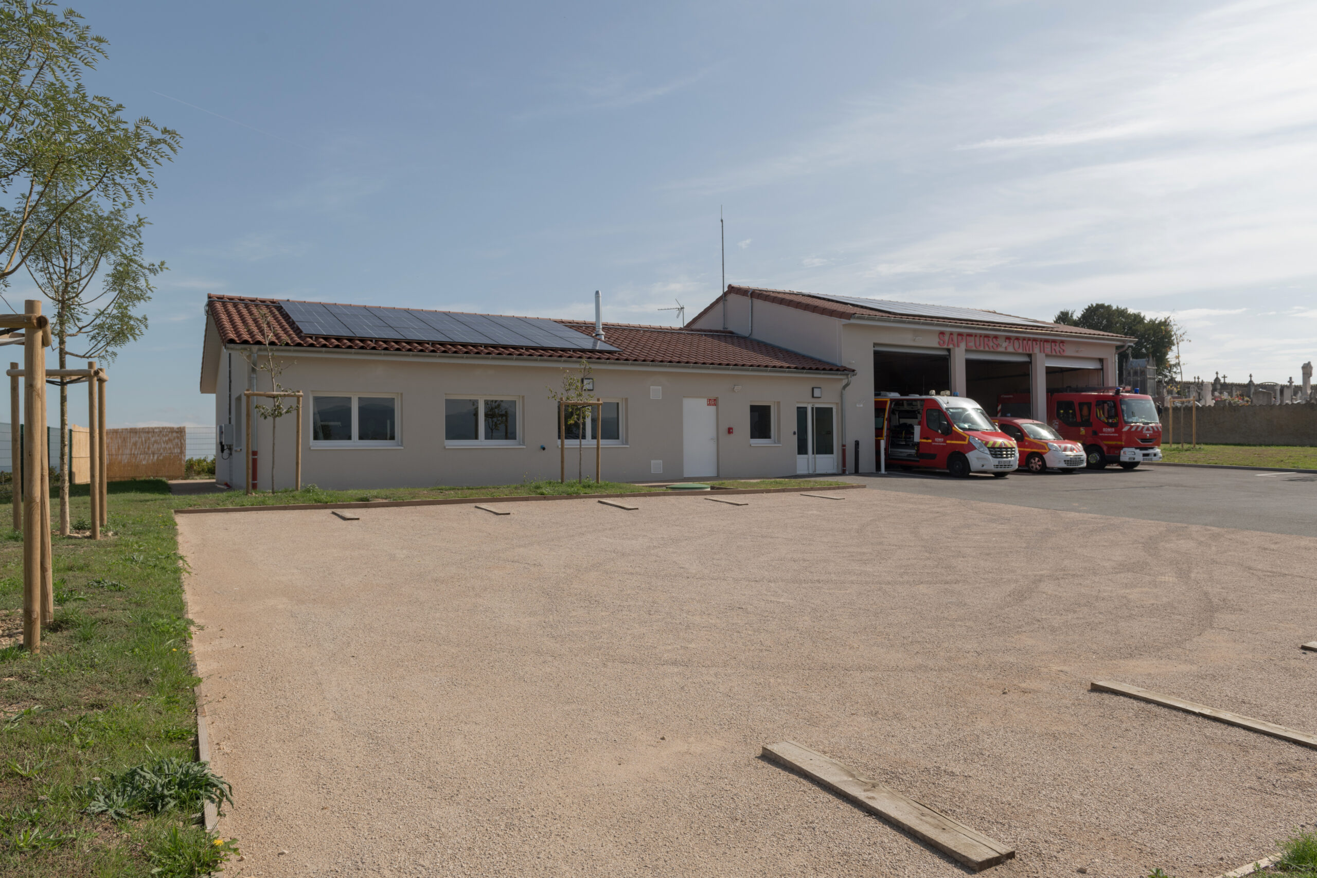 Lors de la conception générale, nous avons privilégié la rapidité d’intervention des pompiers en facilitant le départ des véhicules. Les véhicules légers utilisent la même entrée que les poids-lourds, mais ne se croisent pas pour des raisons de sécurité, afin d’accéder au parking au Nord du terrain. L’aire de manœuvre a été pensée de façon à prendre en compte les rayons de braquage des véhicules lourds. L’aire de manoeuvre et le parking sont les plus compacts possibles et adaptés à l’échelle de la caserne, afin de limiter les zones de circulation. Le parking est réalisé en matériaux drainants et l’aire de lavage bénéficie de l’eau de récupération des toitures.