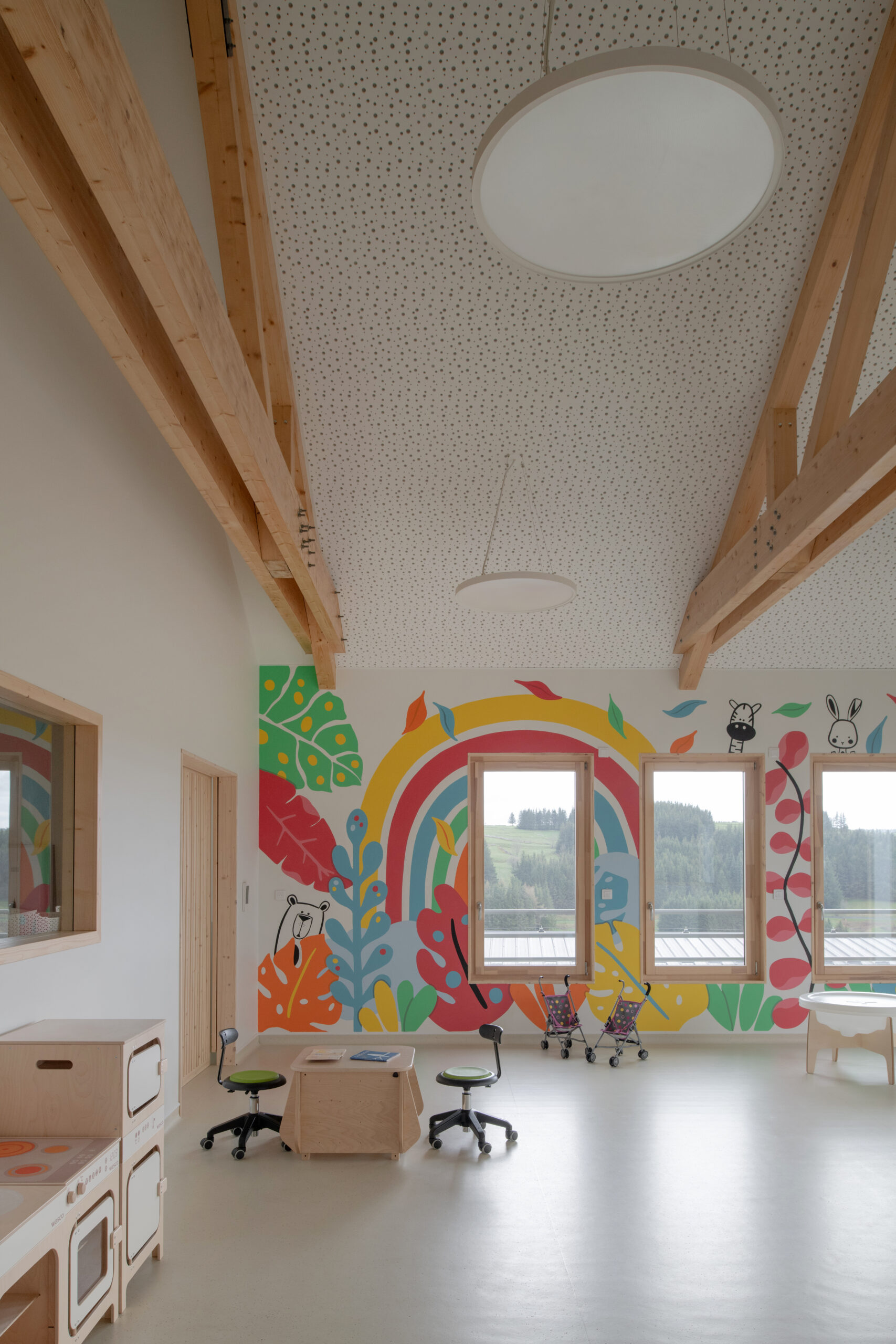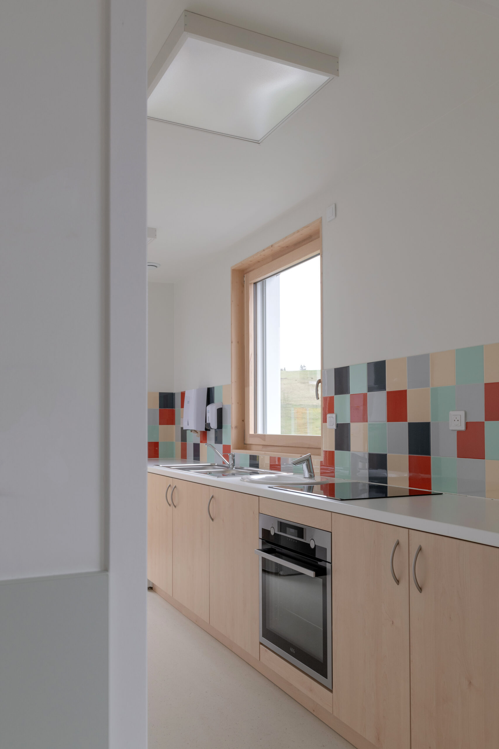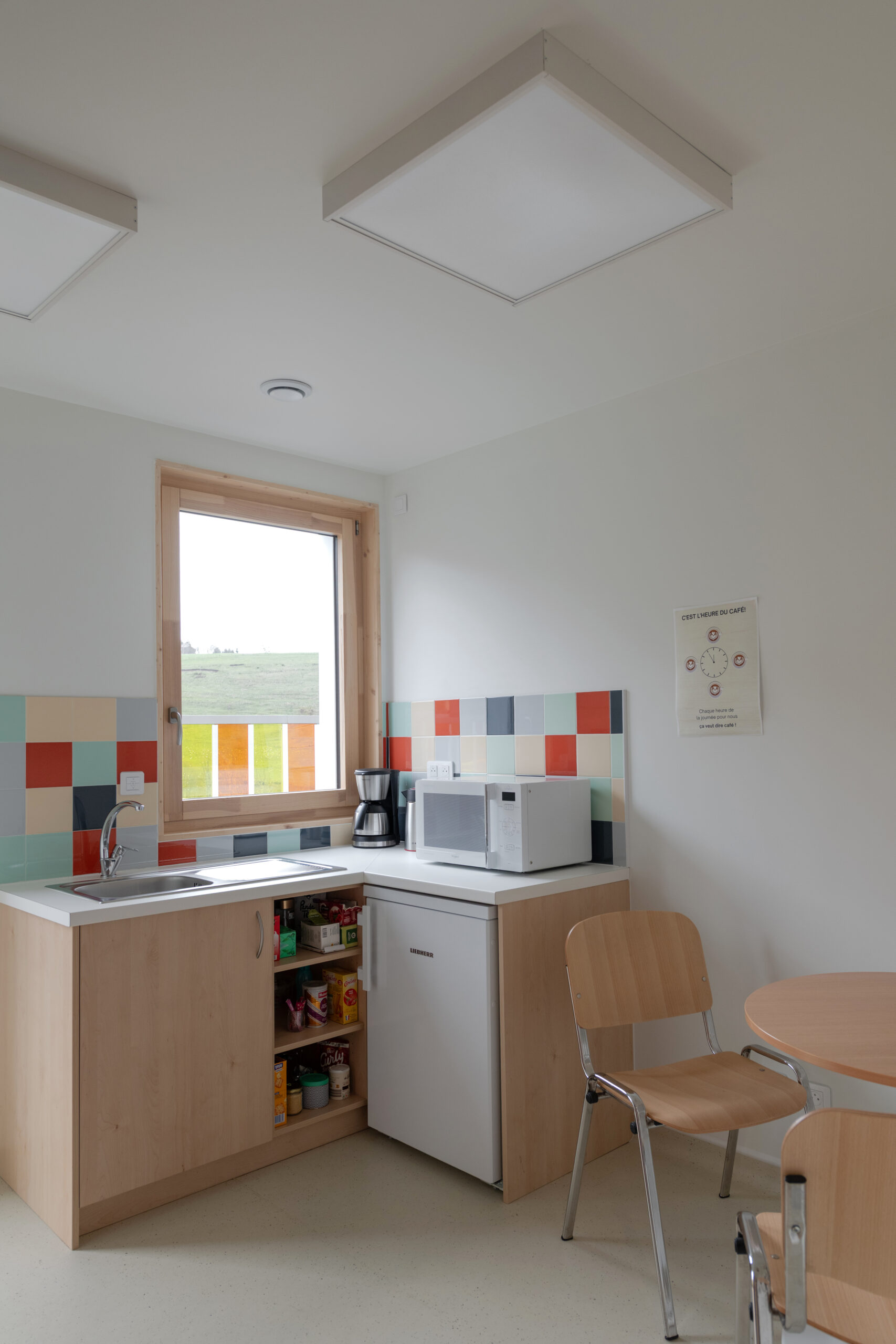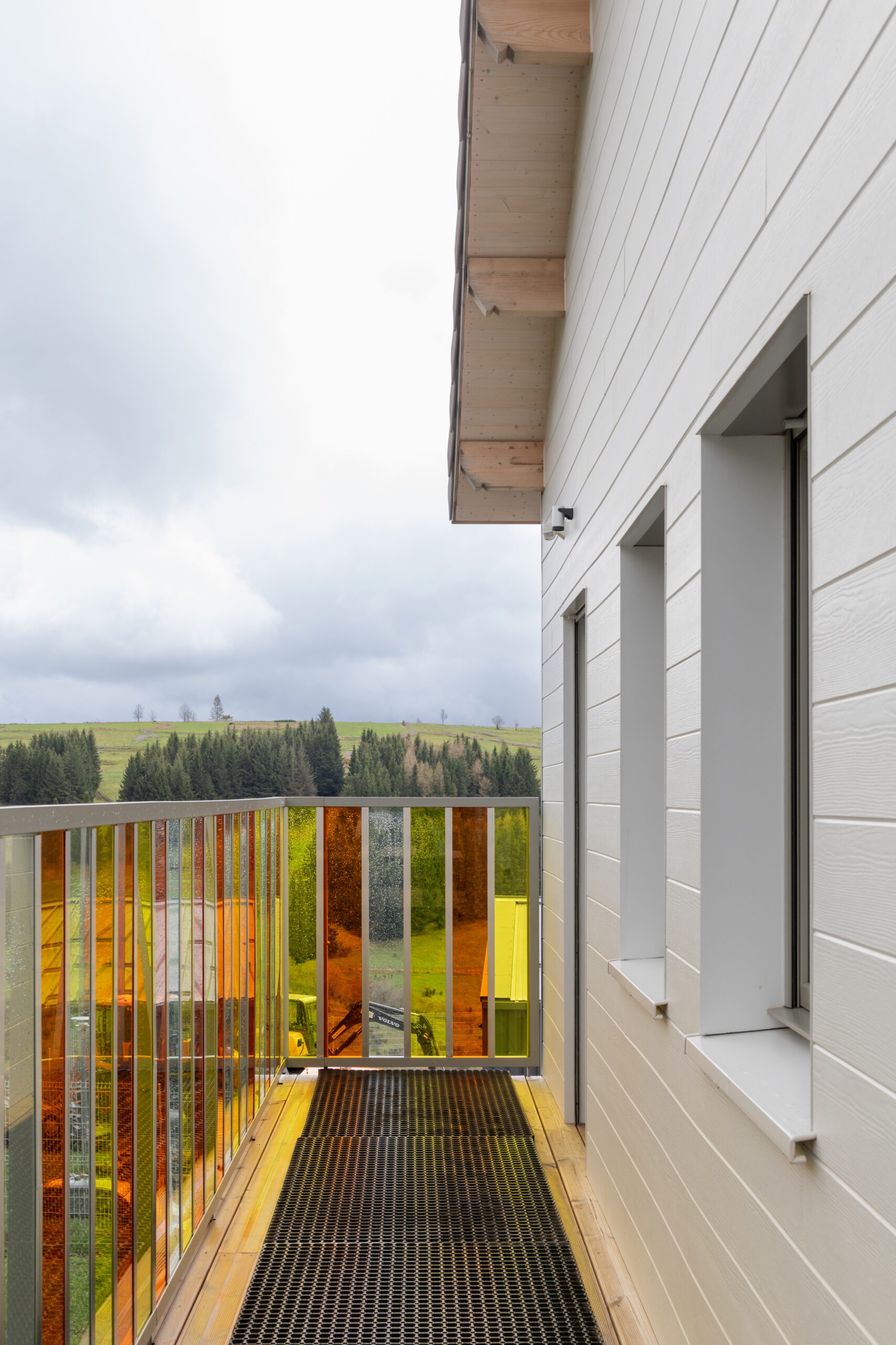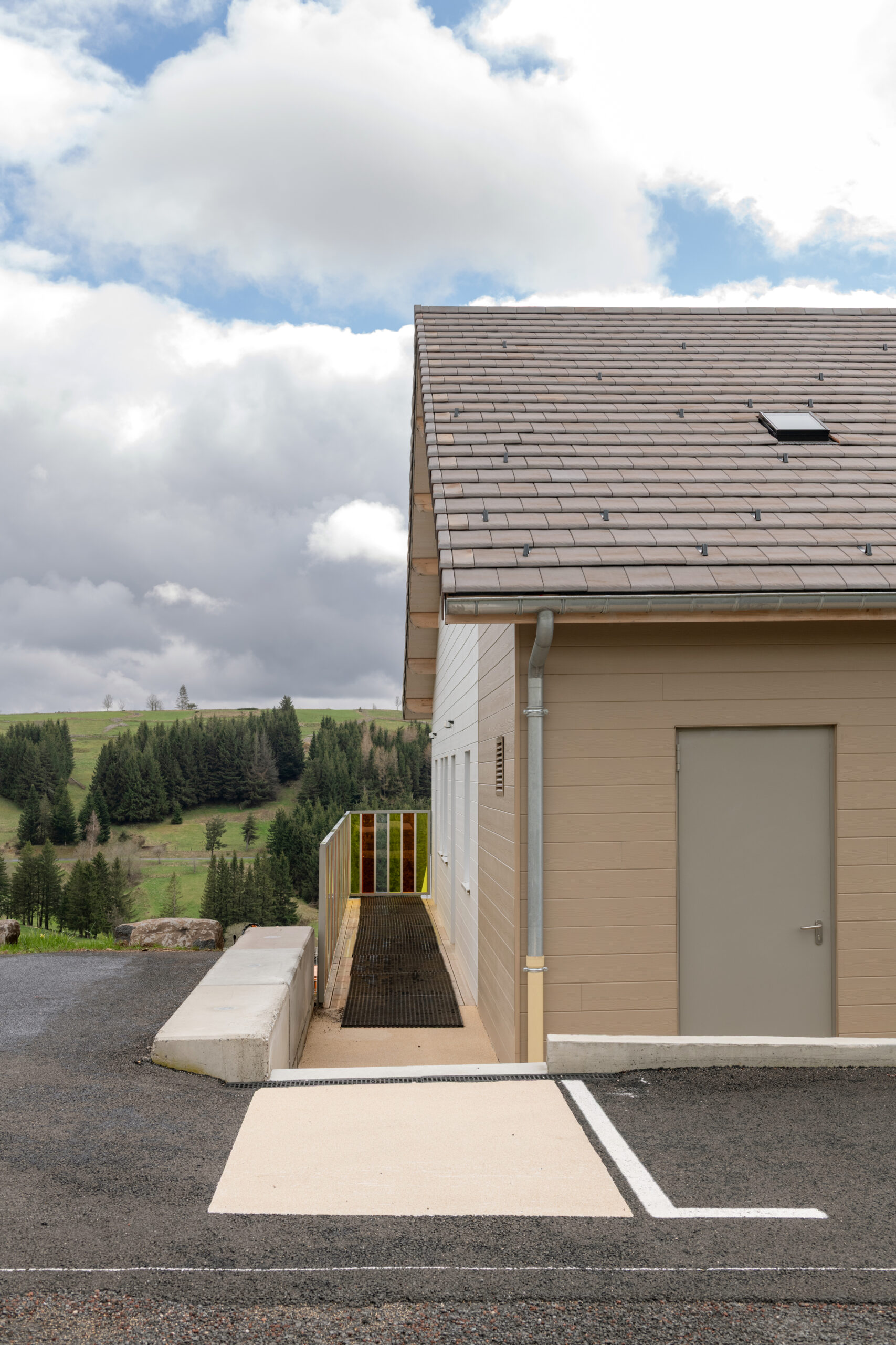 Les façades sont traitées en enduit minéral tons clairs et bardage composite type pose horizontale. La charpente est traditionnelle surmontée d’une toiture en tuiles de terre cuite de teinte rouge. Le terrain en forte pente et la nécessité d’un accès de plain-pied depuis la route nous ont guidé vers une construction avec un sous-sol, destiné à du stockage de matériel lié aux activités de la commune (centre de loisirs, décorations de Noël, petit matériel, etc.). Le sous-sol accueillera aussi un local technique et le silo pour les granulés.