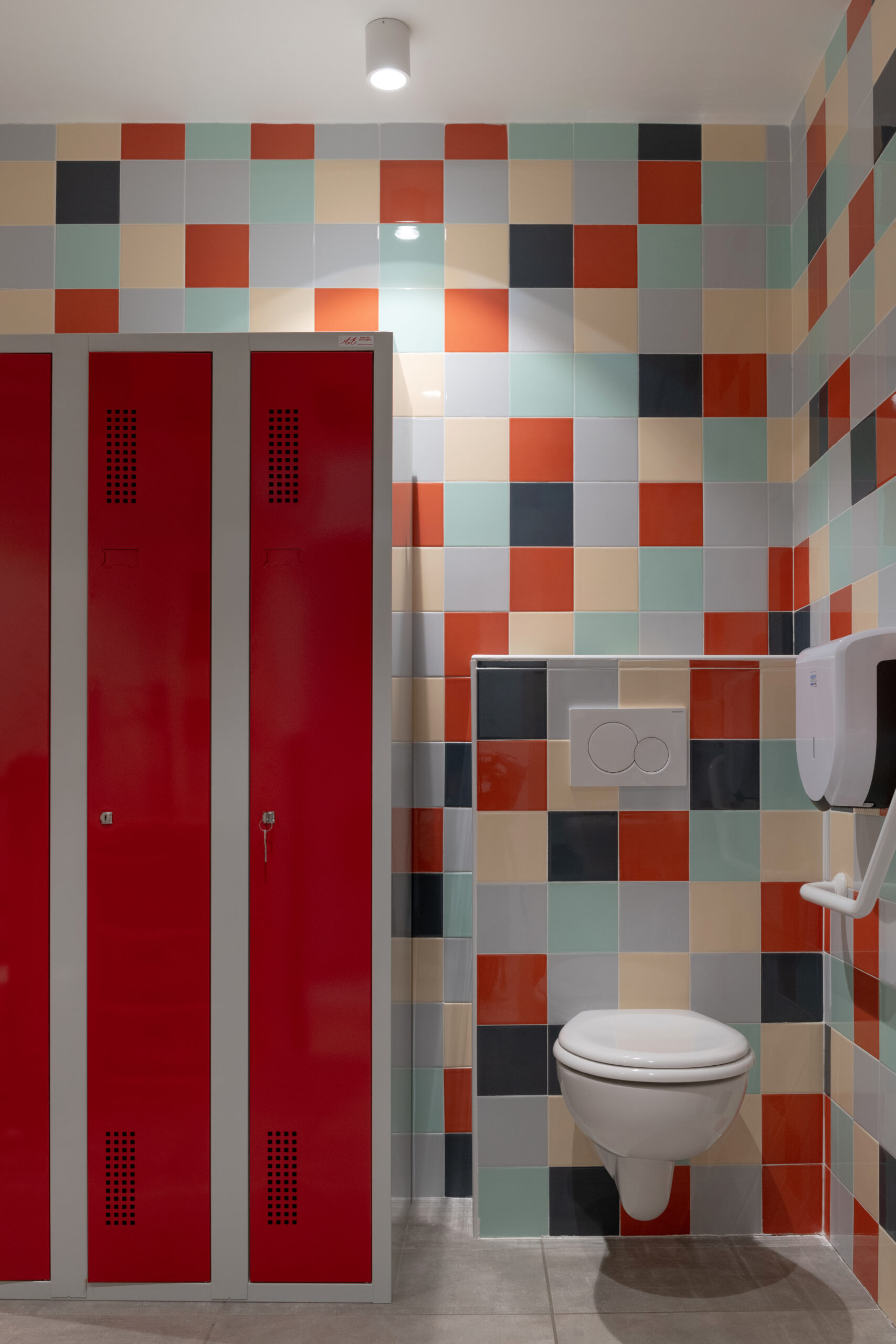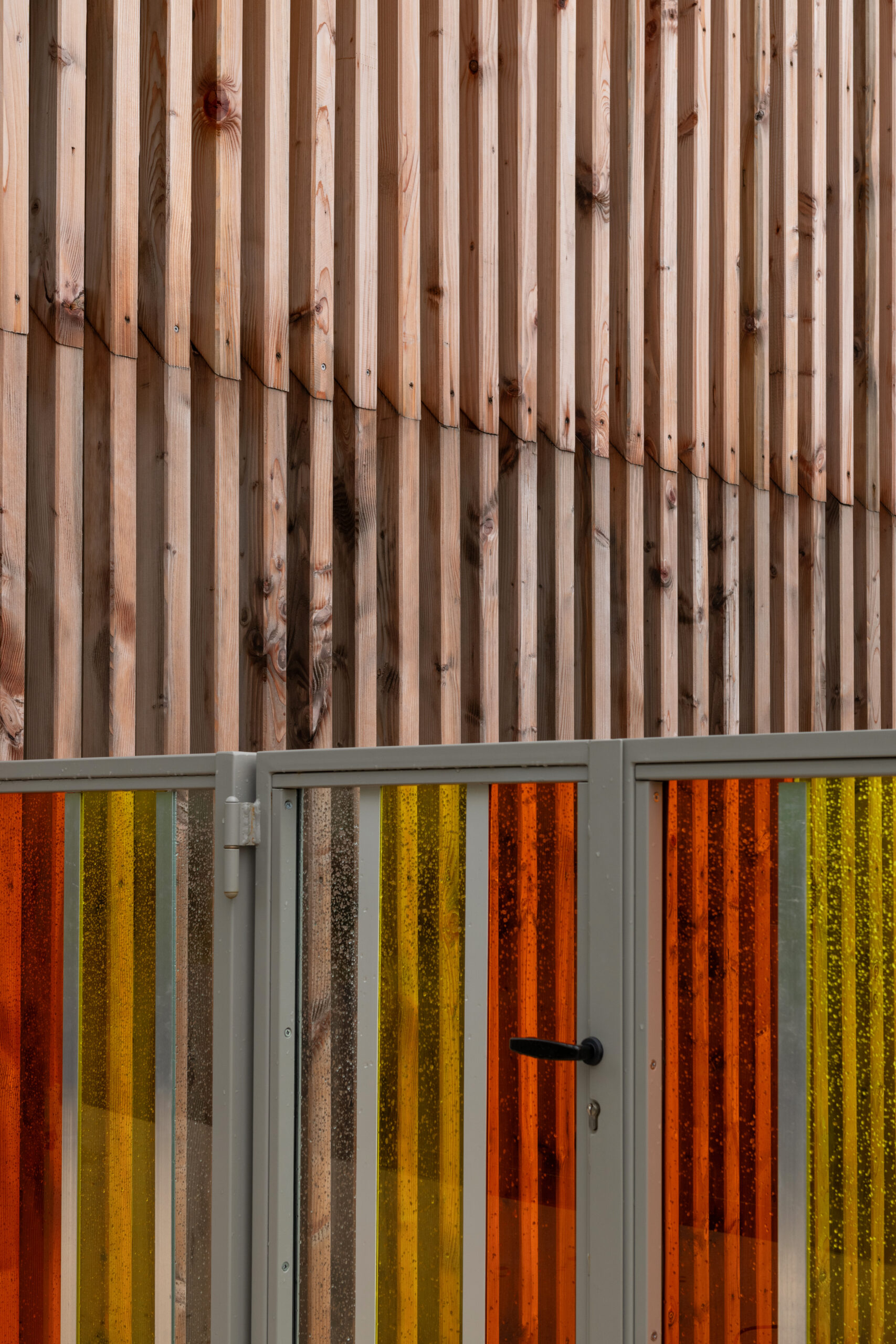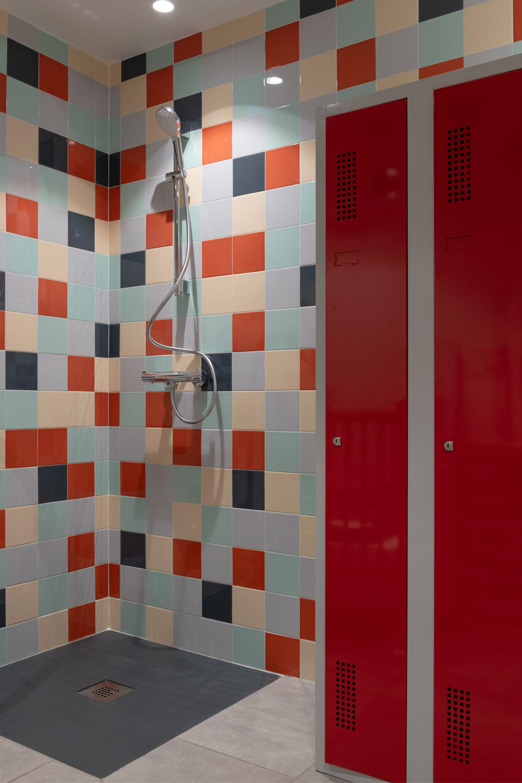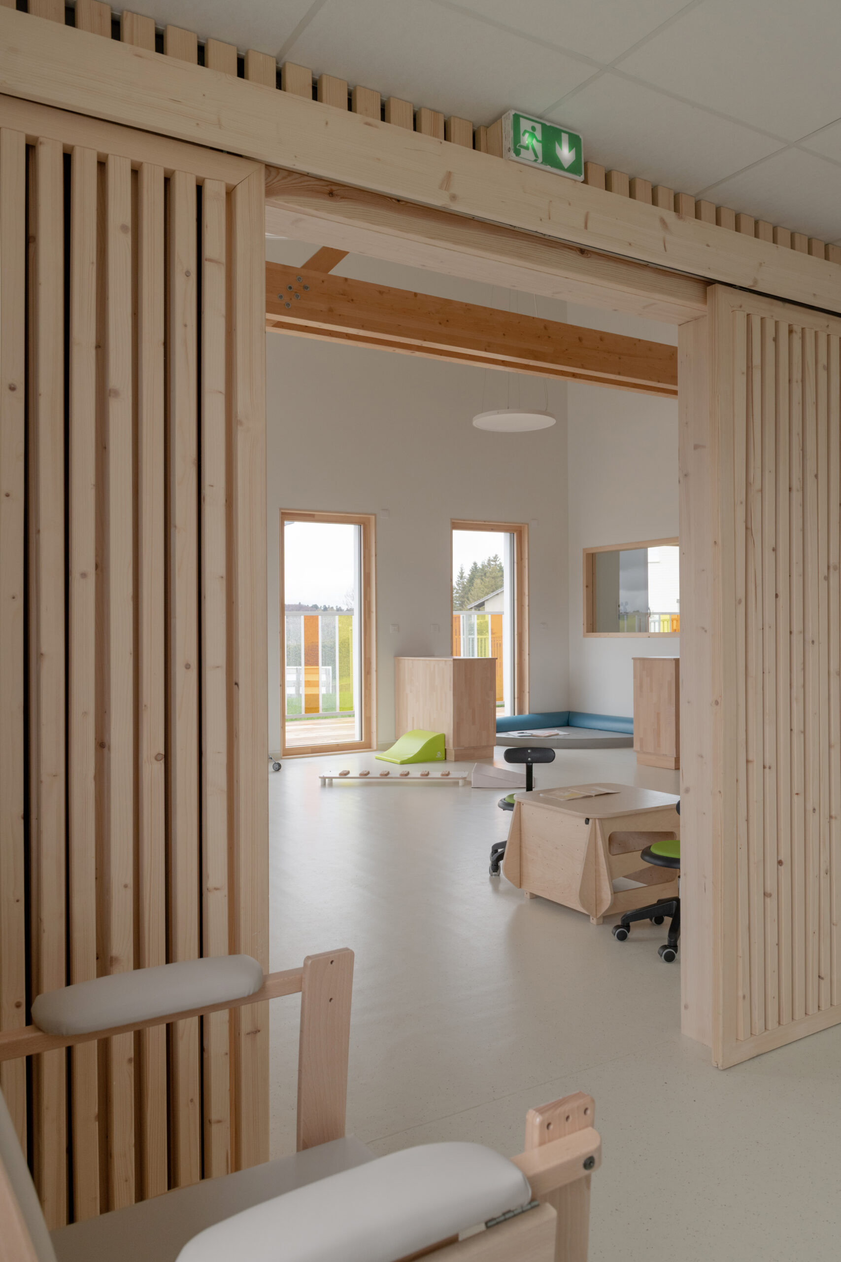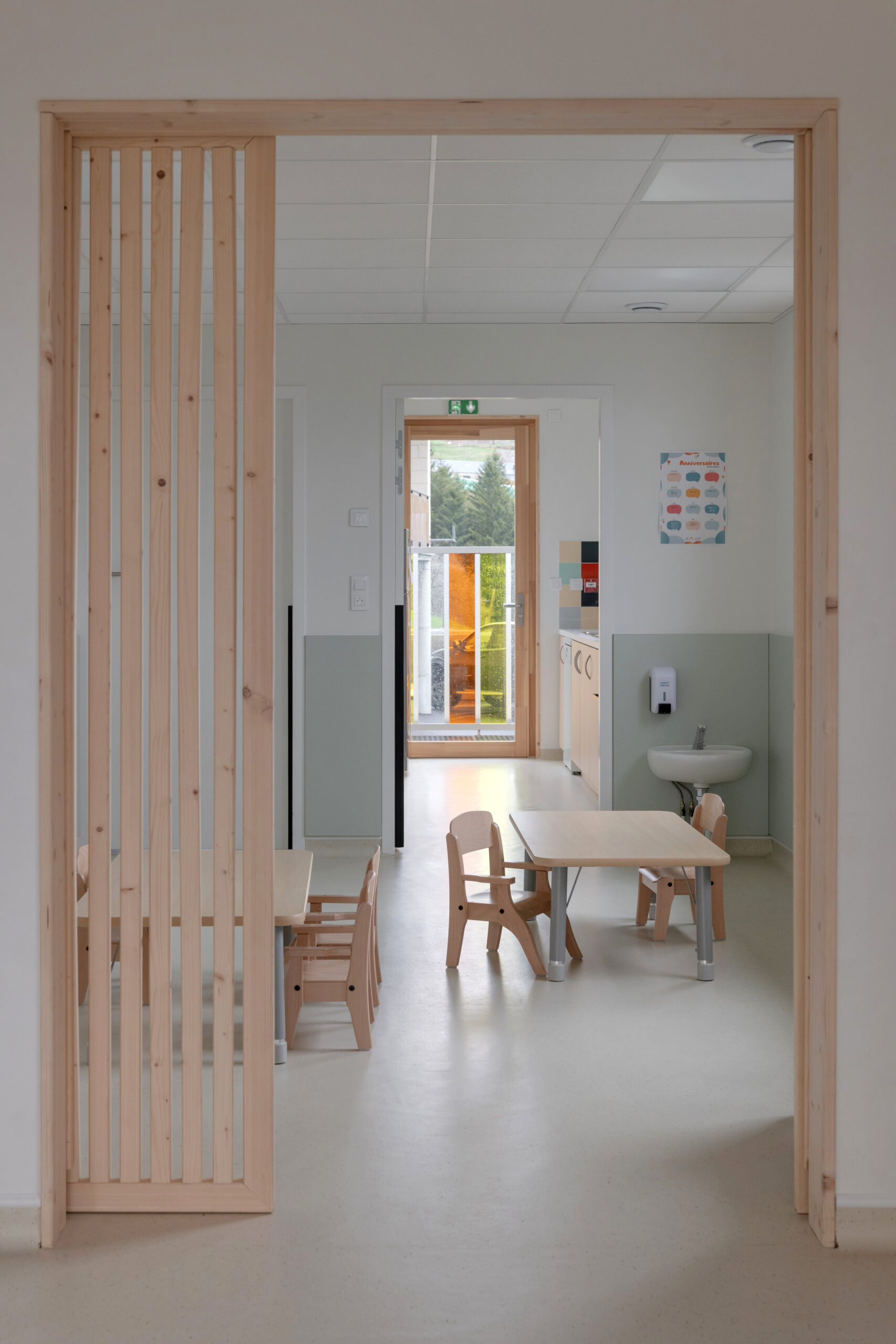 Les façades sont traitées en enduit minéral tons clairs et bardage composite type pose horizontale. La charpente est traditionnelle surmontée d’une toiture en tuiles de terre cuite de teinte rouge. Le terrain en forte pente et la nécessité d’un accès de plain-pied depuis la route nous ont guidé vers une construction avec un sous-sol, destiné à du stockage de matériel lié aux activités de la commune (centre de loisirs, décorations de Noël, petit matériel, etc.). Le sous-sol accueillera aussi un local technique et le silo pour les granulés.