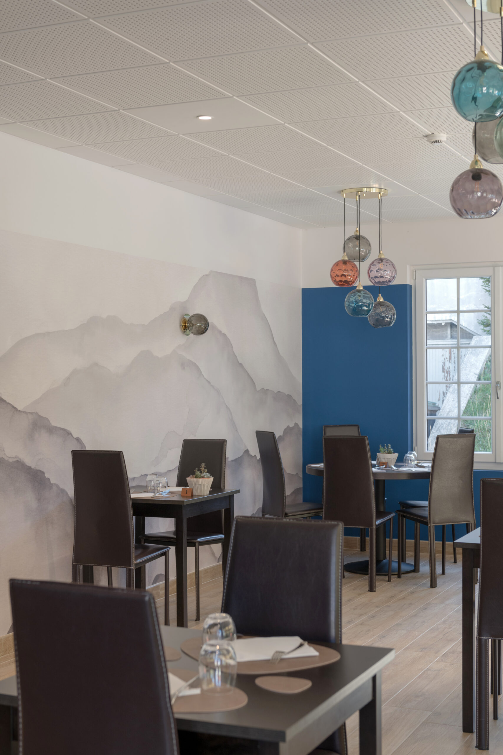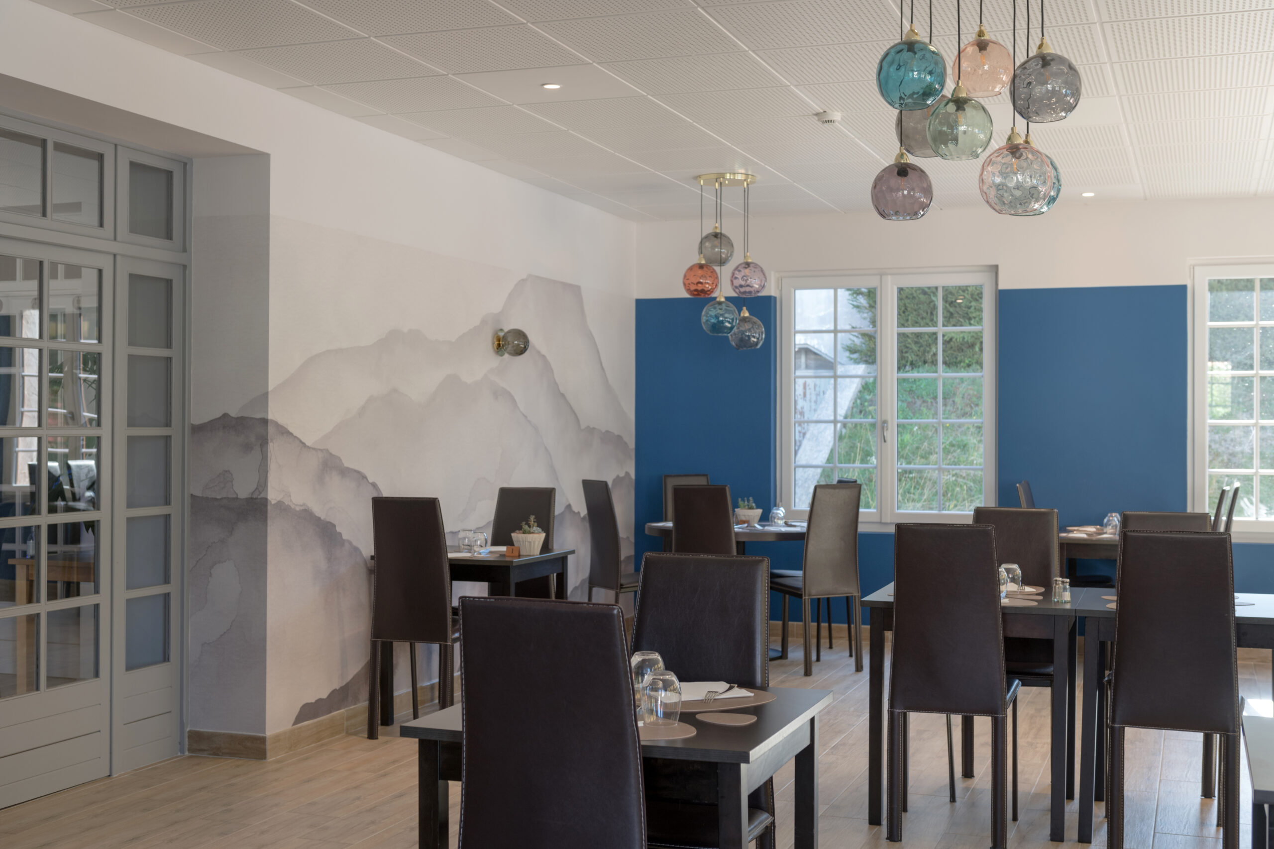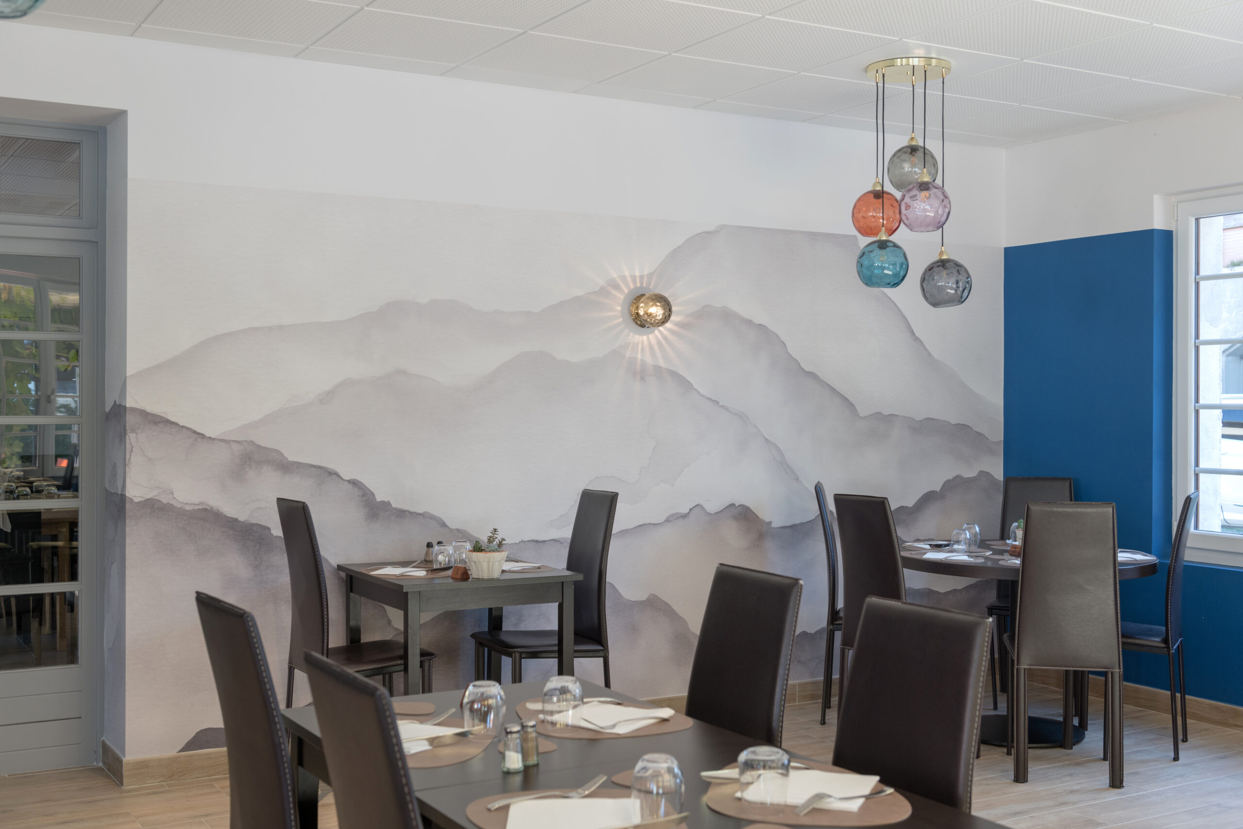Dans la salle de restaurant, l’association d’un papier peint «Cévennes noir et blanc» avec un bleu profond permet de révéler la luminosité du plafond blanc.