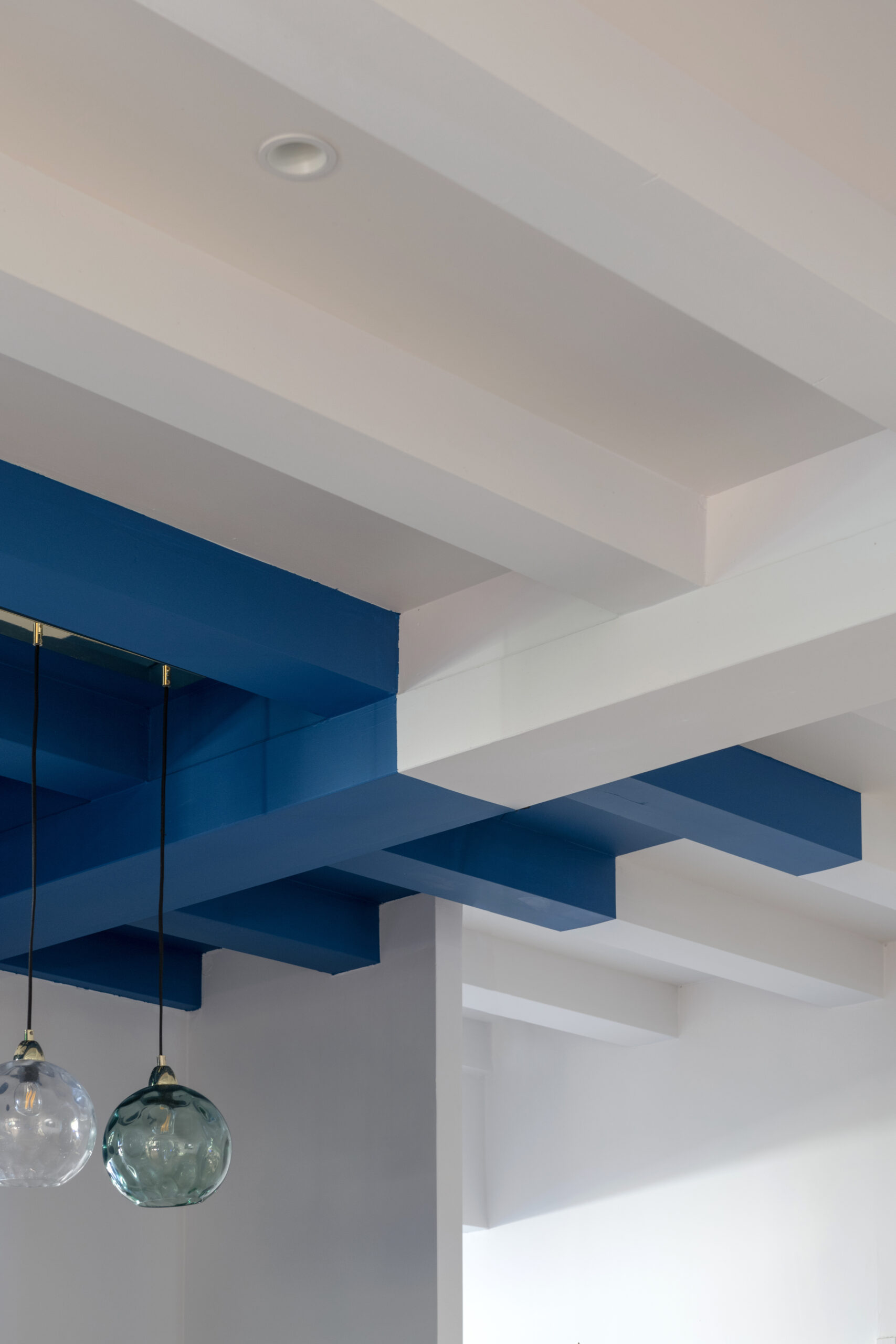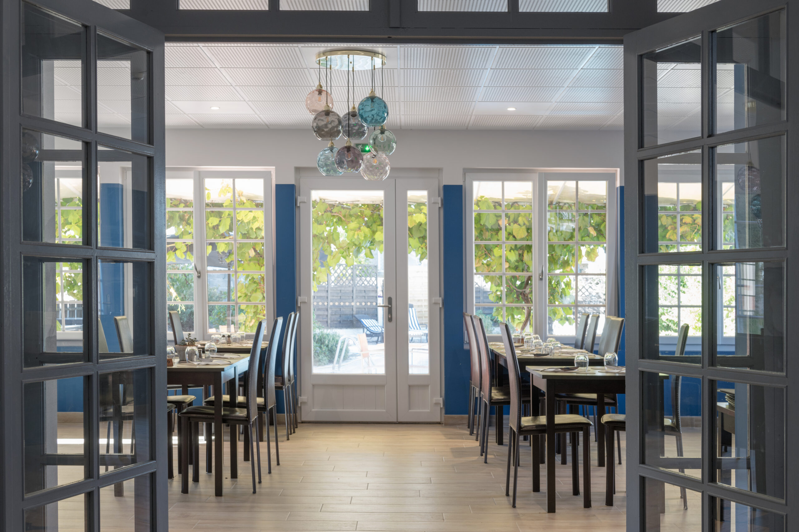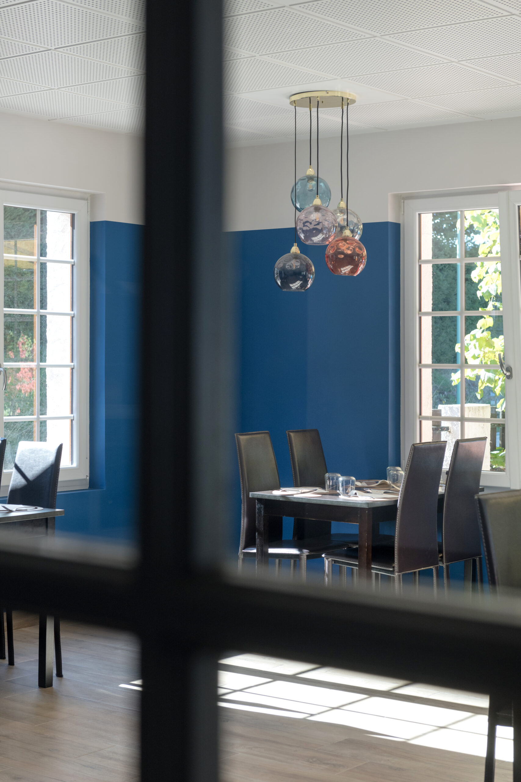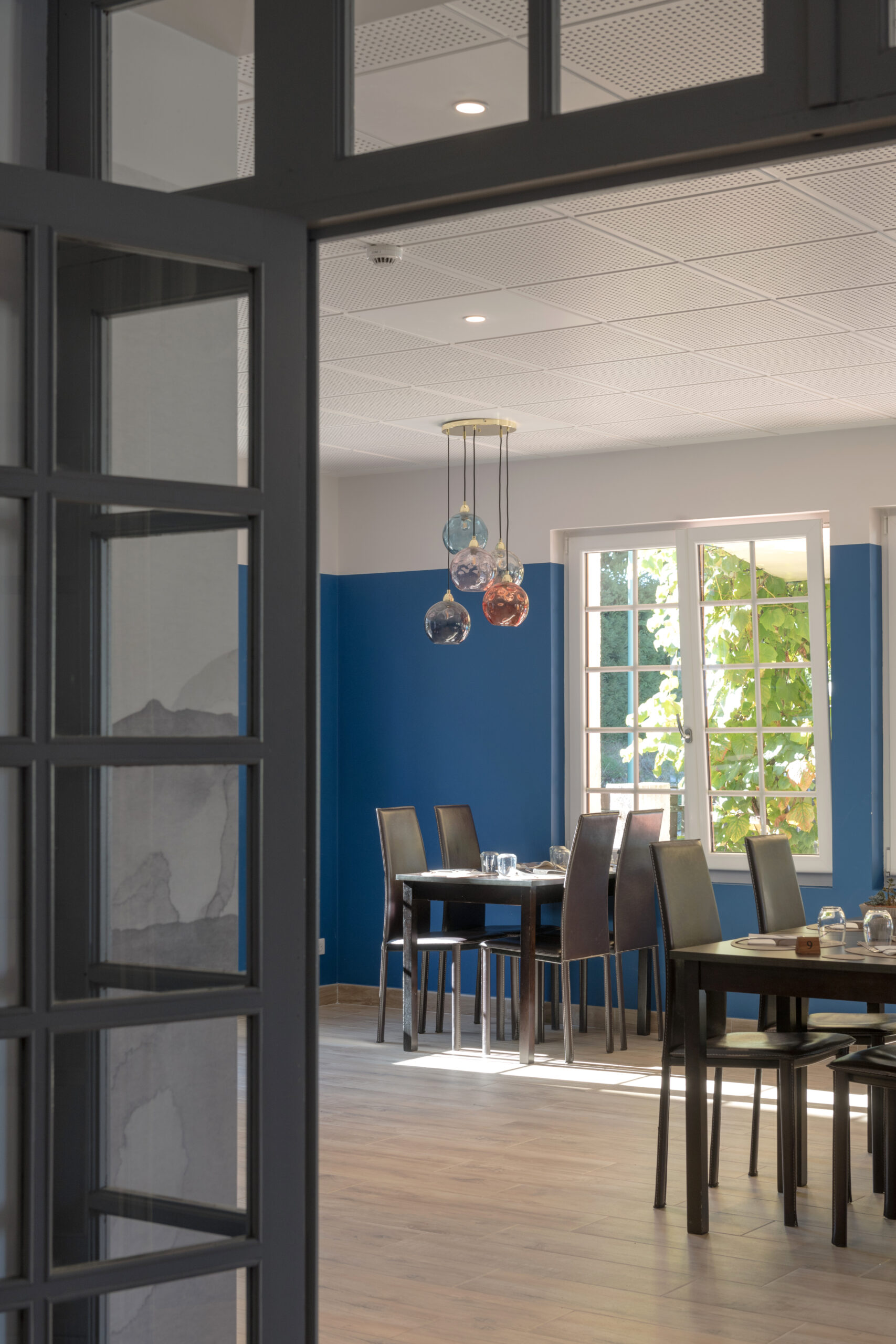 Dans la salle de restaurant, l’association d’un papier peint «Cévennes noir et blanc» avec un bleu profond permet de révéler la luminosité du plafond blanc.