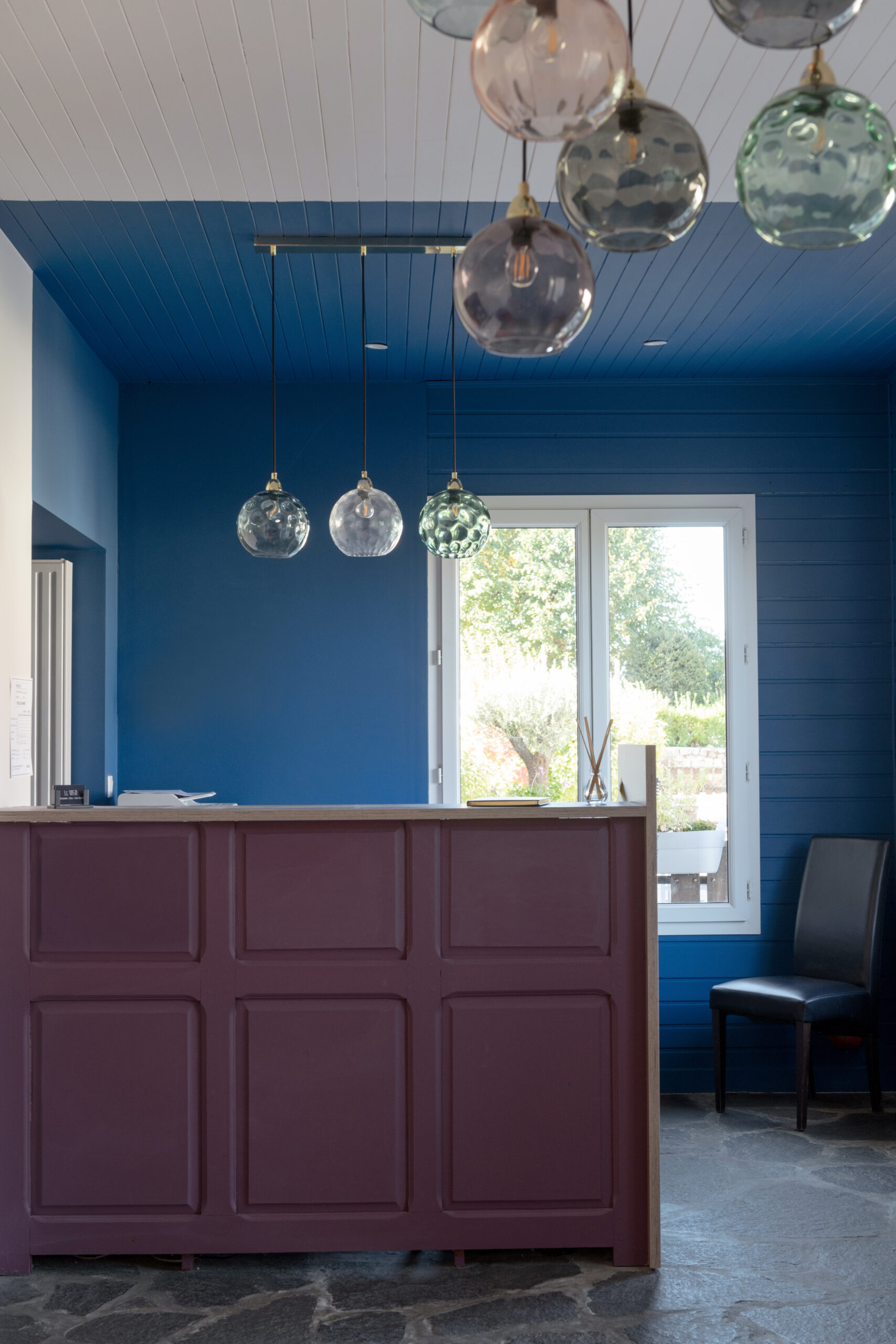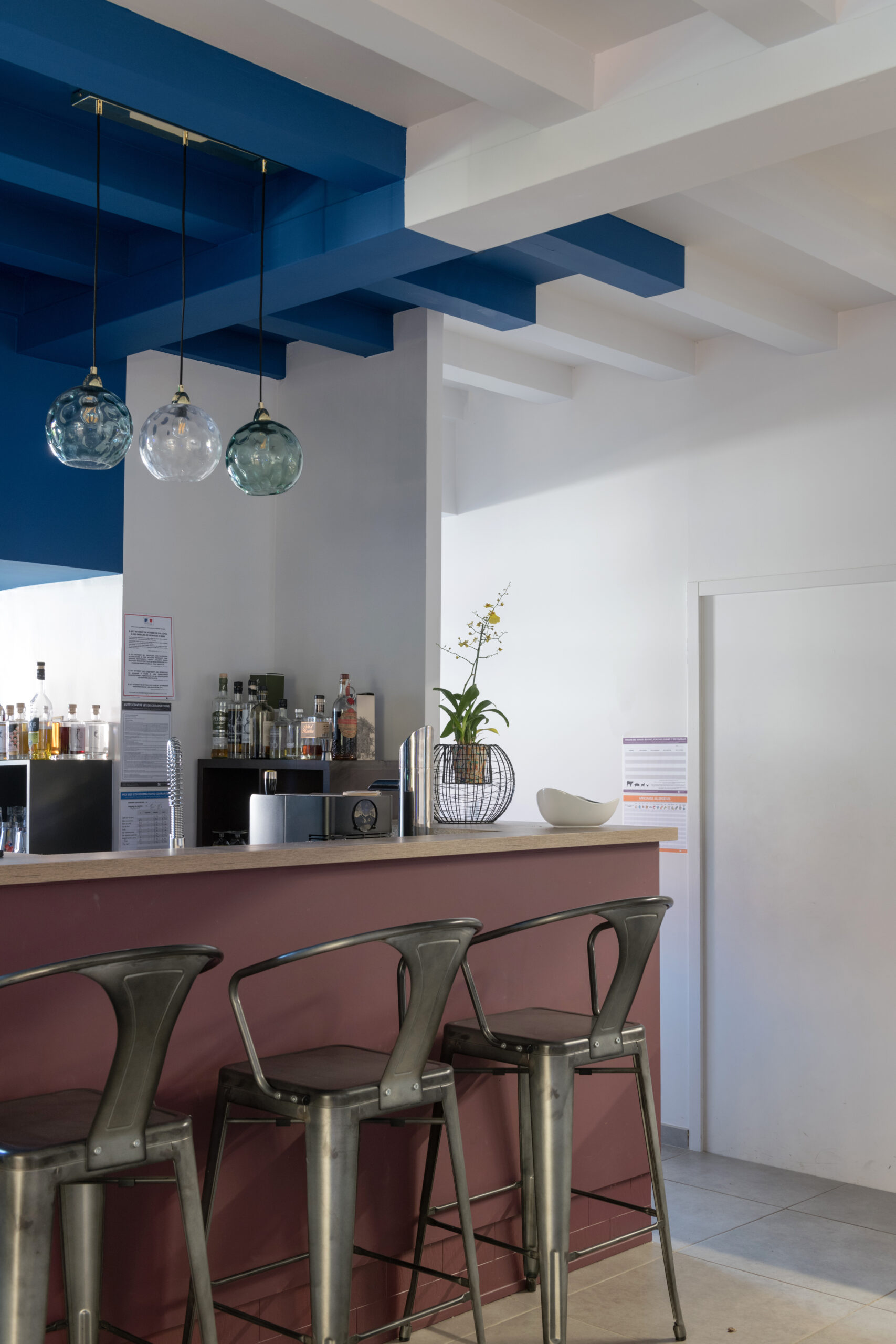 Le bar est mis en valeur par deux teintes : le bleu se marie avec un pourpre, reprenant ainsi les couleurs de la charte graphique du lieu.