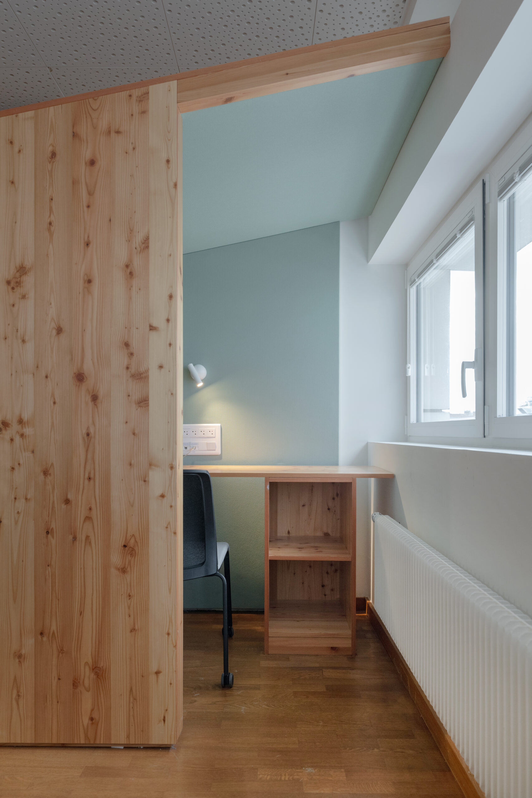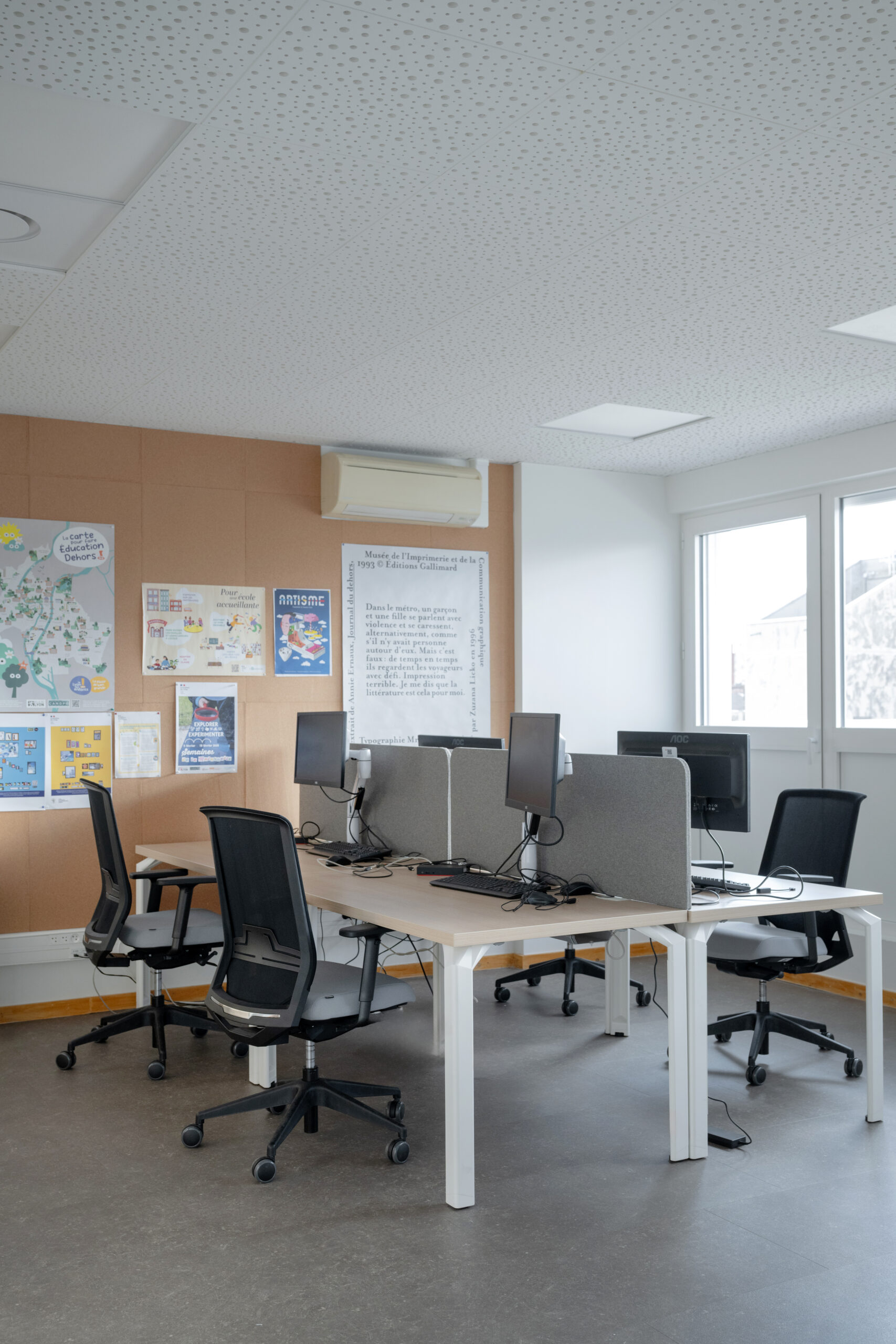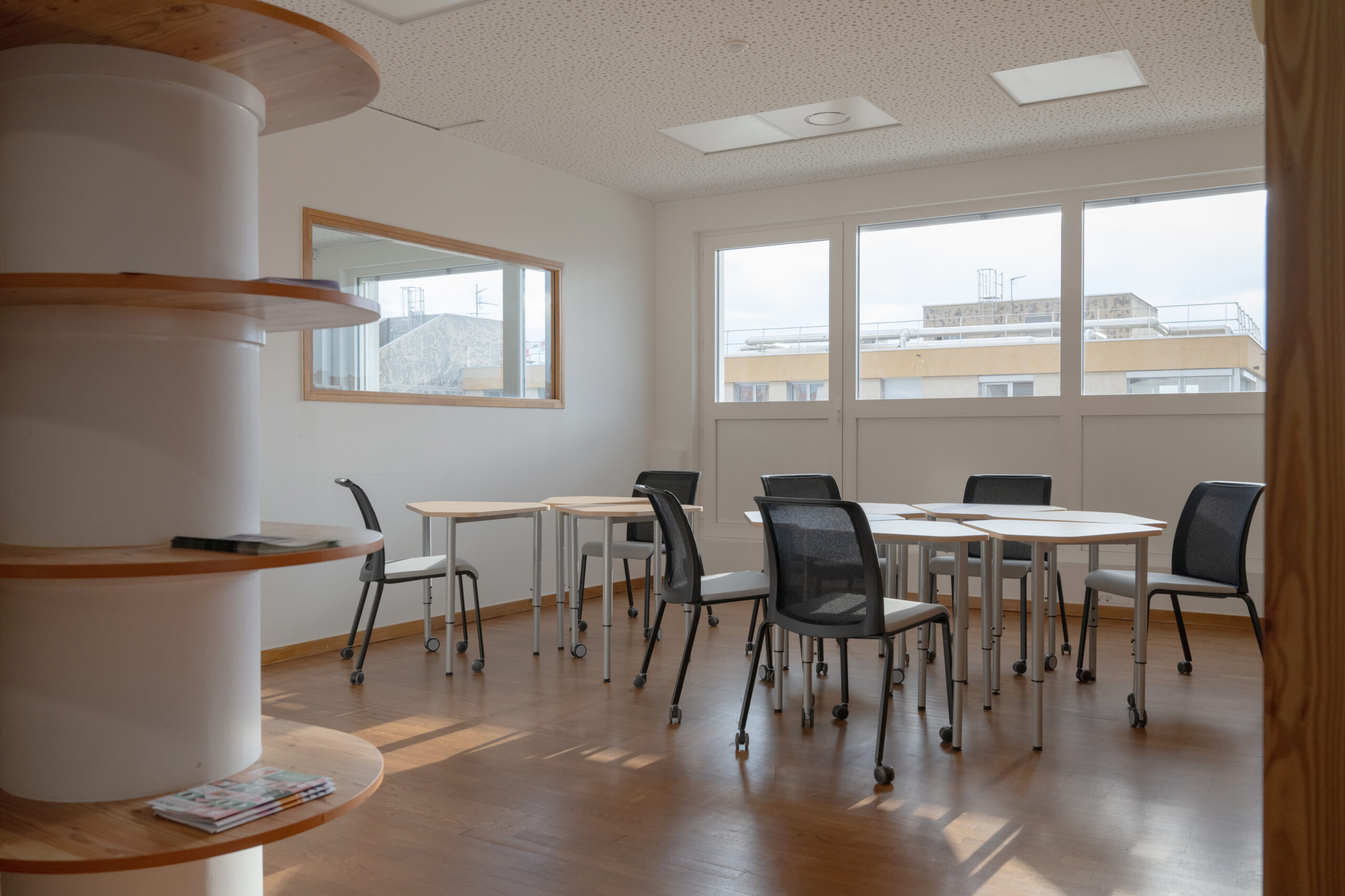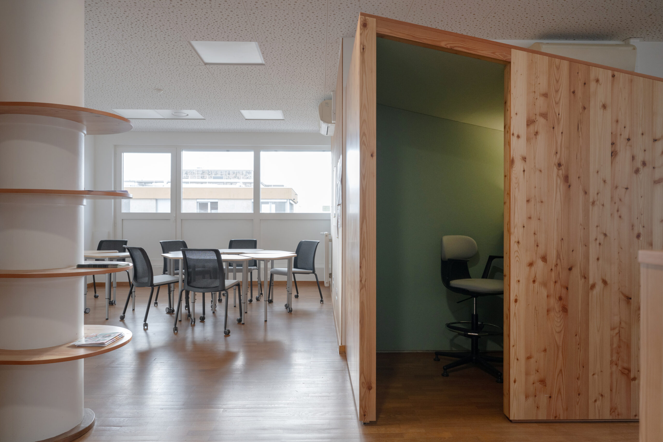 Dans le but de réunir sur un seul lieu l’ensemble des conseillers pédagogiques départementaux, un ancien logement de fonction et une mezzanine, situés au 6ème étage, sont entièrement repensés en espace de travail optimisé.