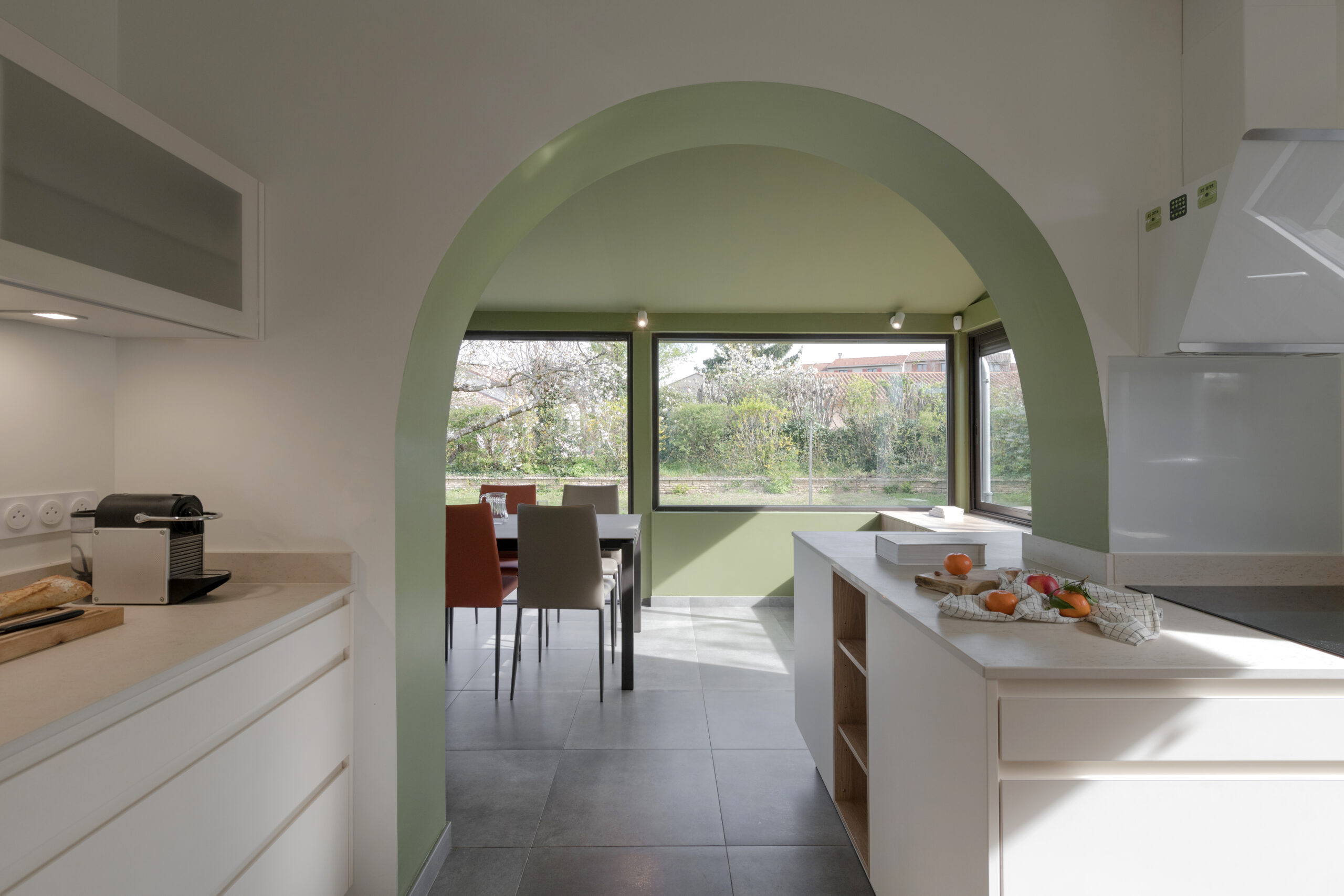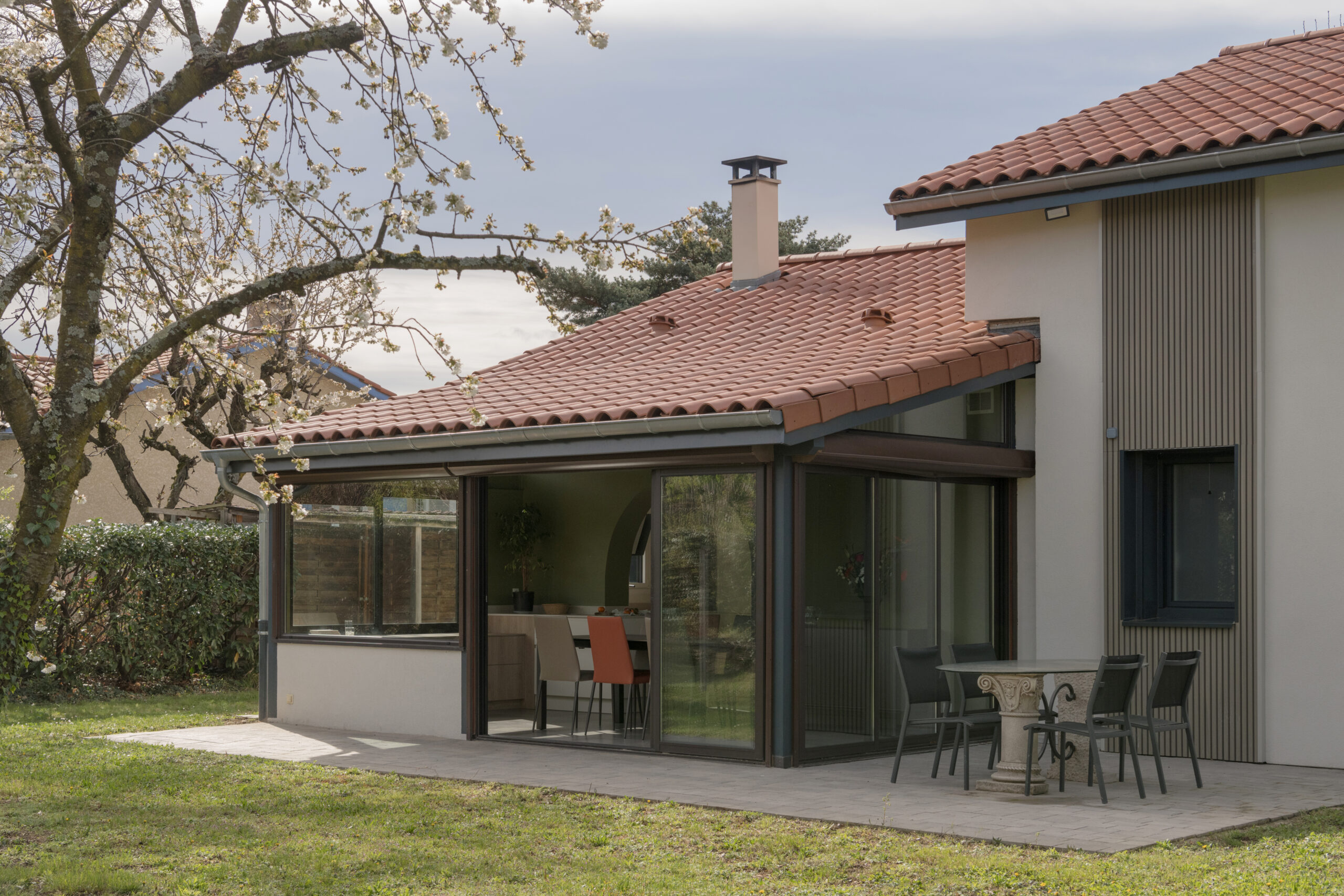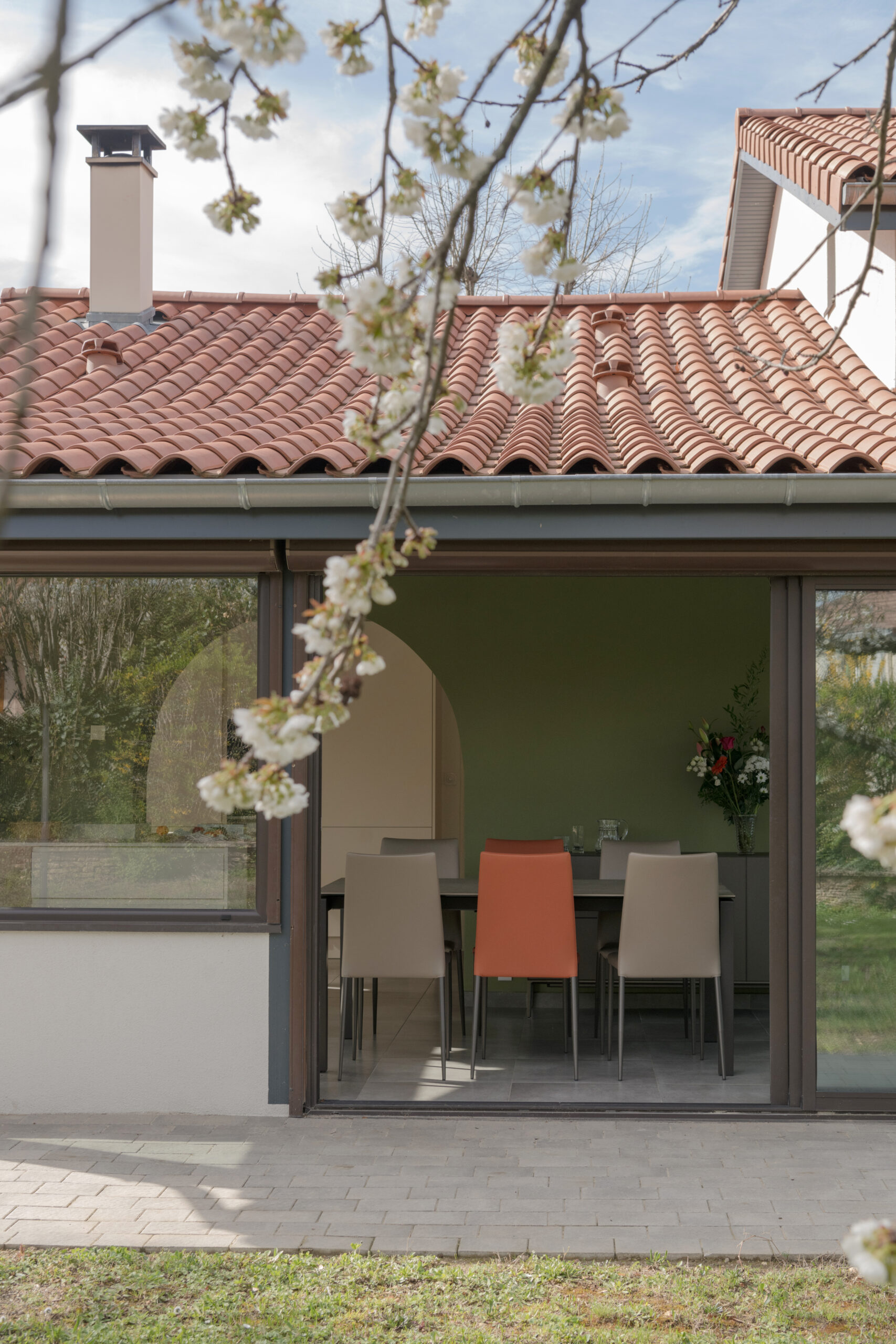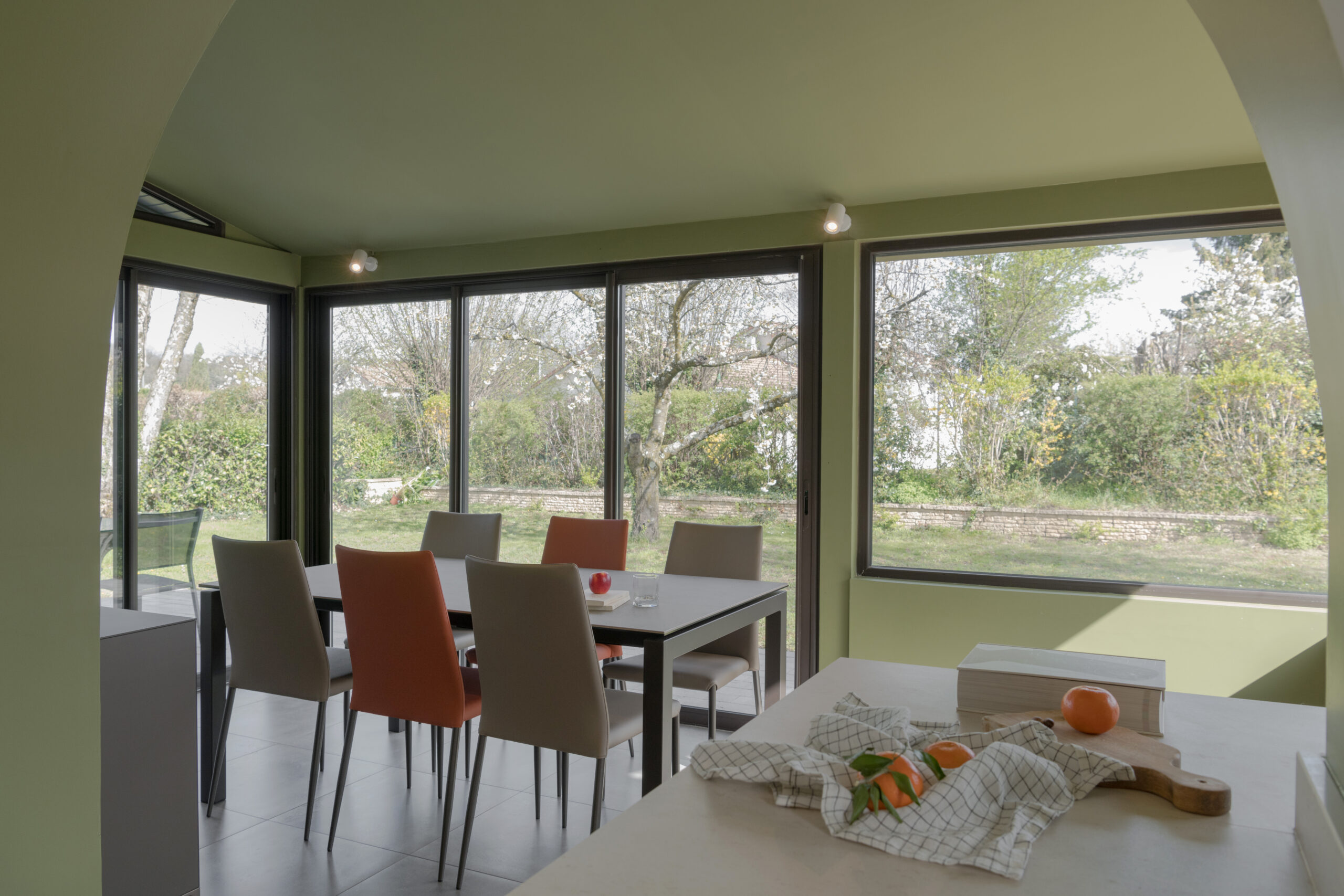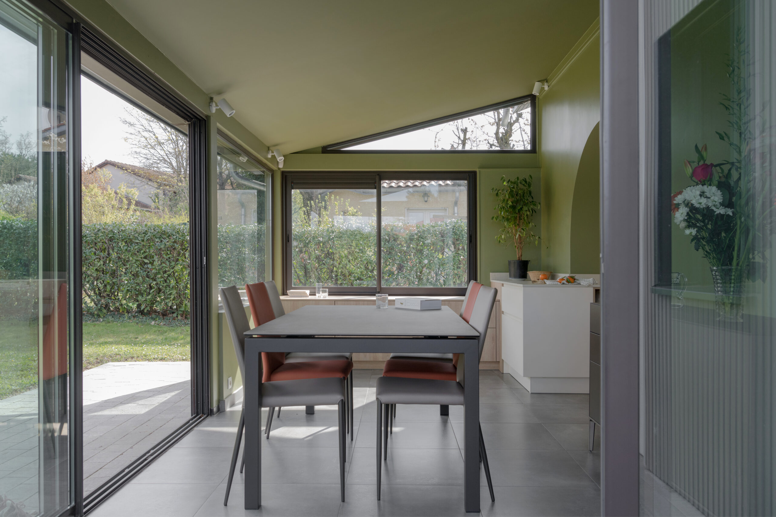 A l’intérieur, la cuisine, la salle à manger et la salle de bain ont été intégralement rénovées. L’enjeu principal était la modernisation des espaces. L’ouverture de la cuisine sur la véranda nécessitait d’être exploitée.