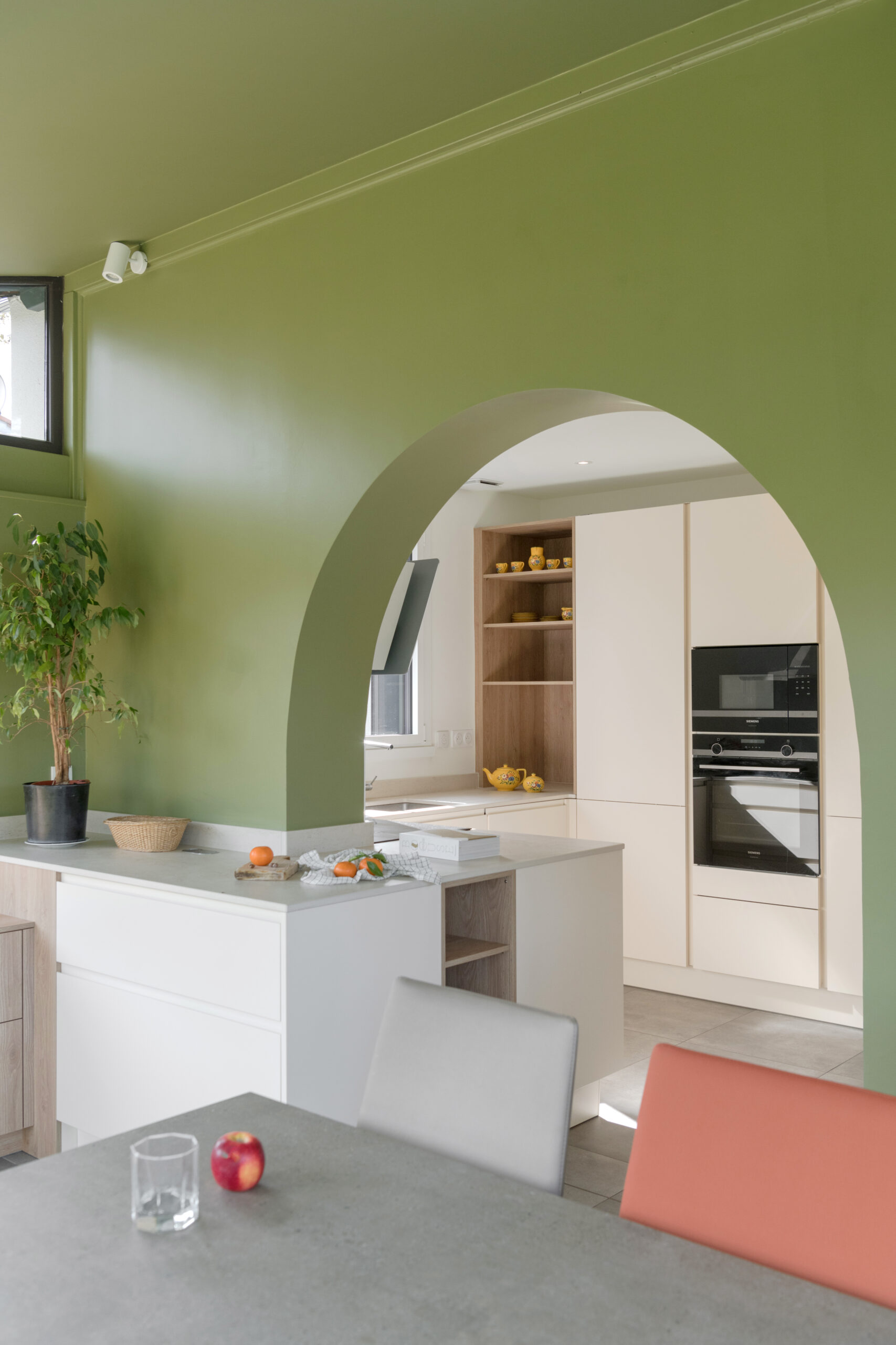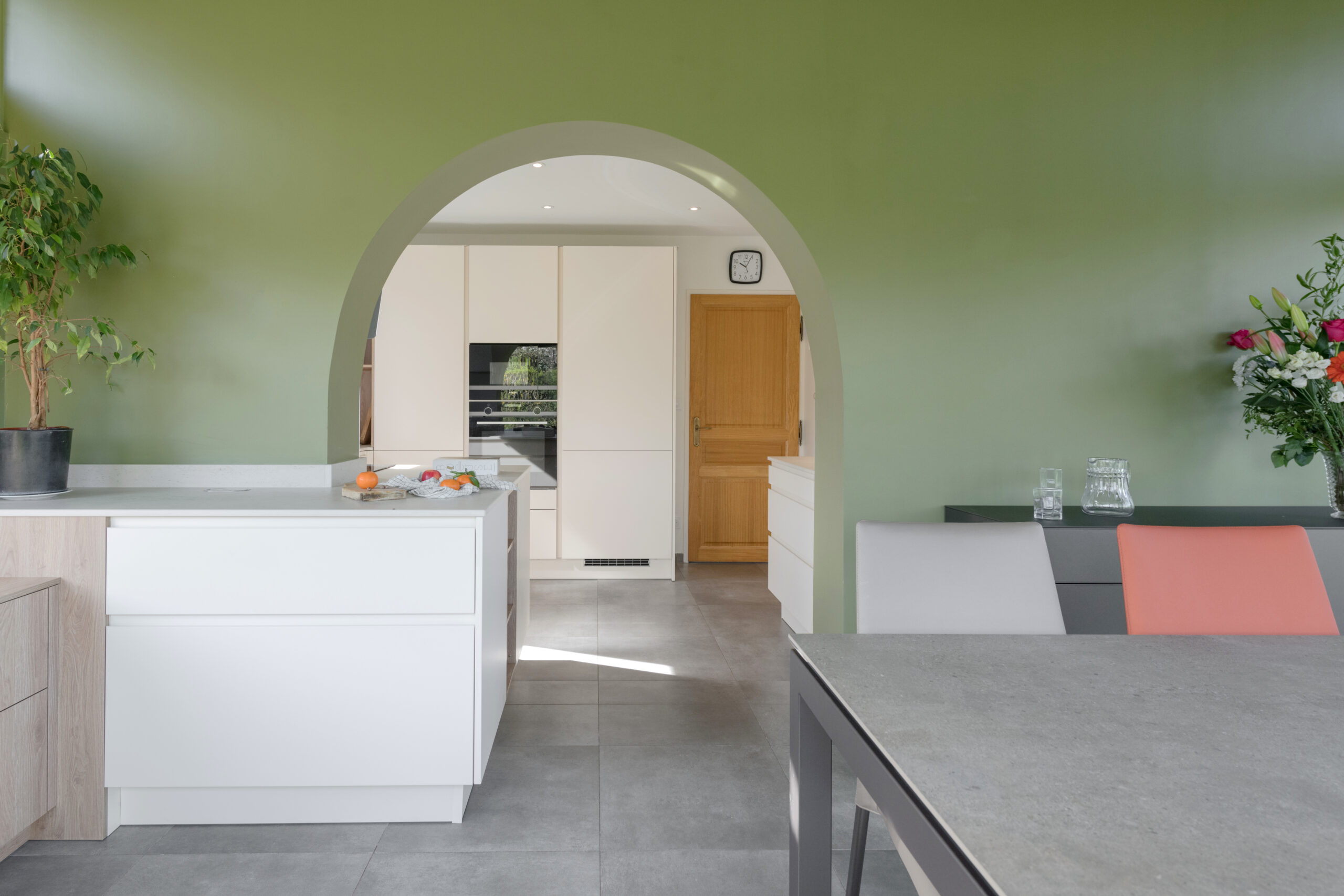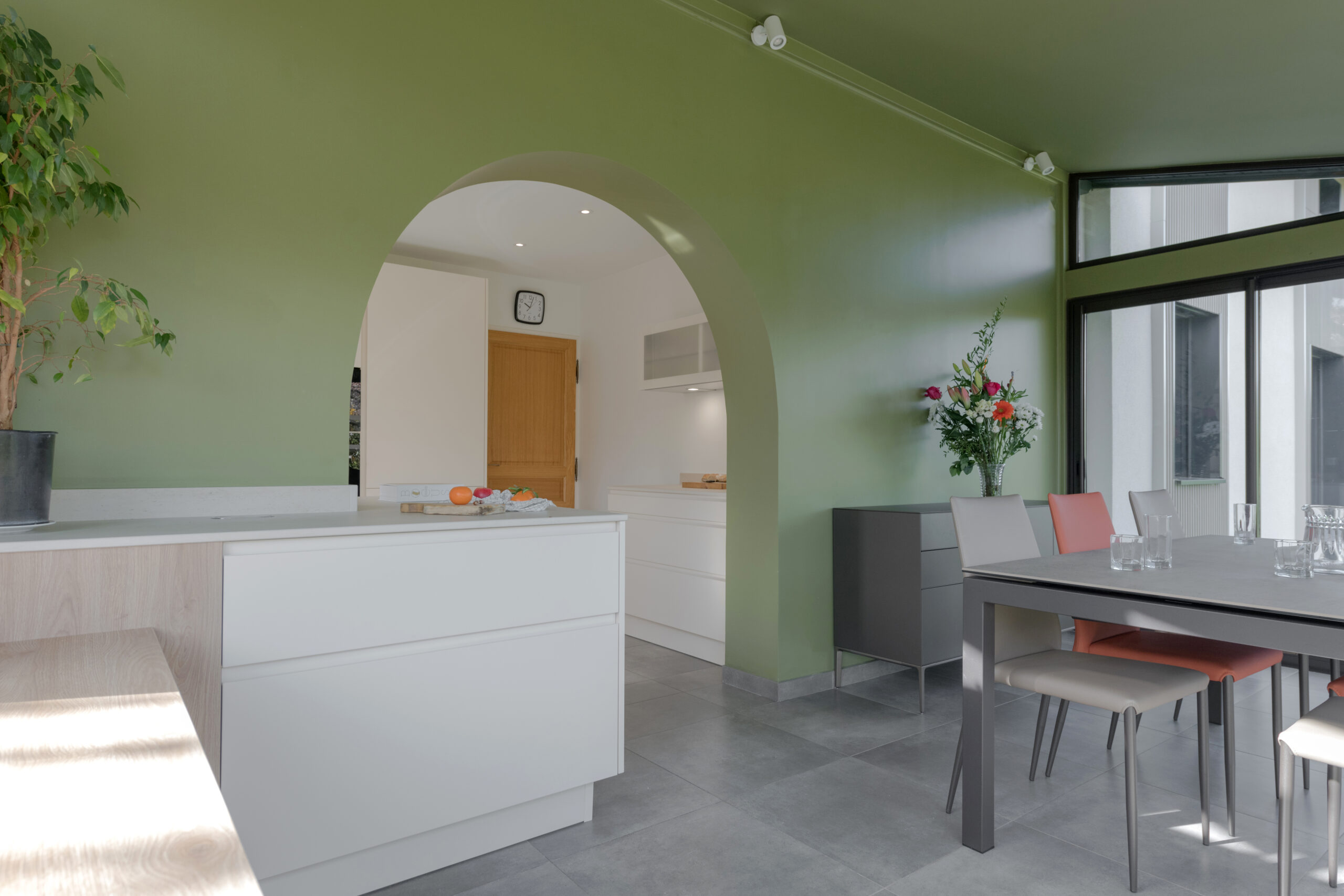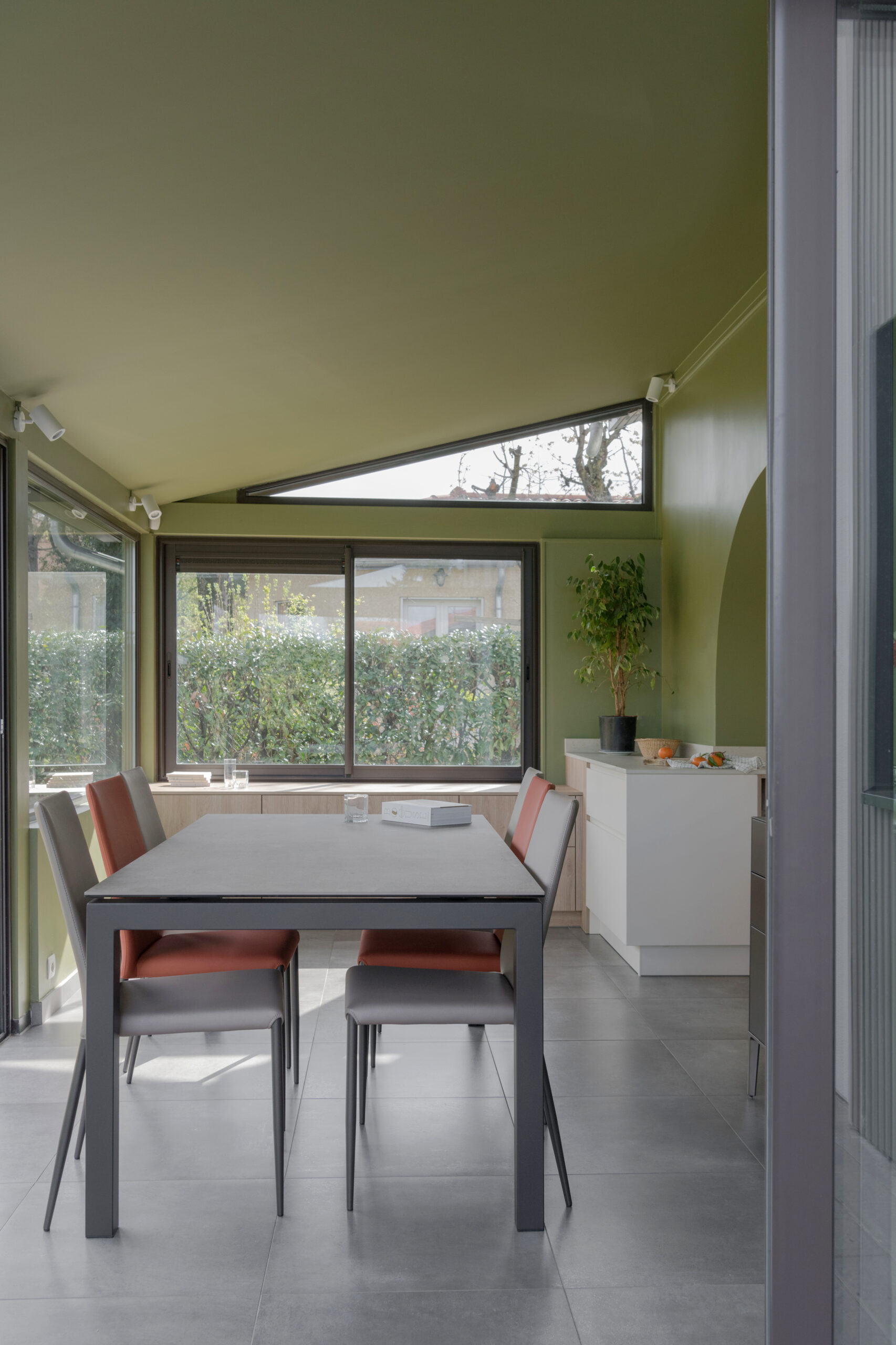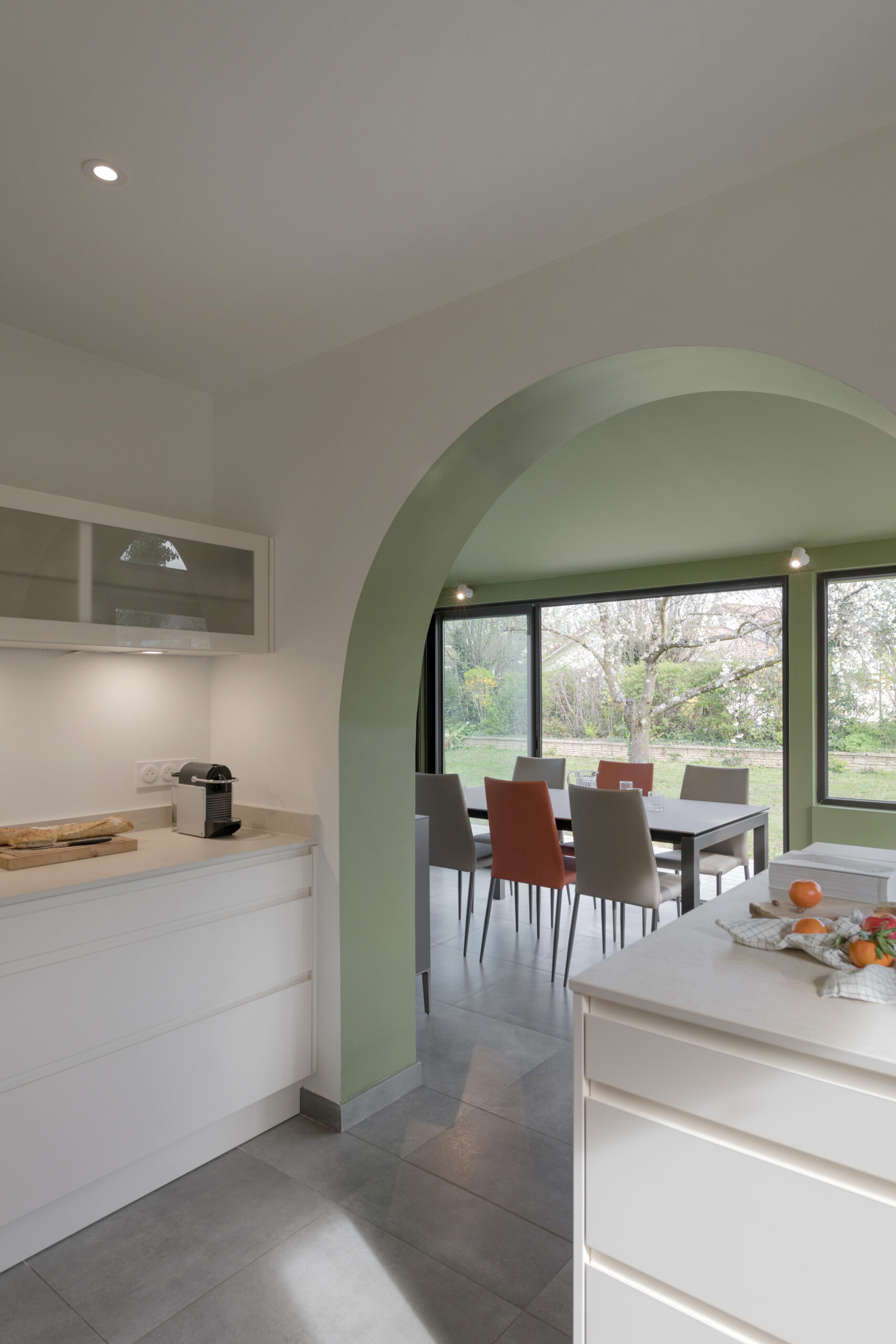A l’intérieur, la cuisine, la salle à manger et la salle de bain ont été intégralement rénovées. L’enjeu principal était la modernisation des espaces. L’ouverture de la cuisine sur la véranda nécessitait d’être exploitée.