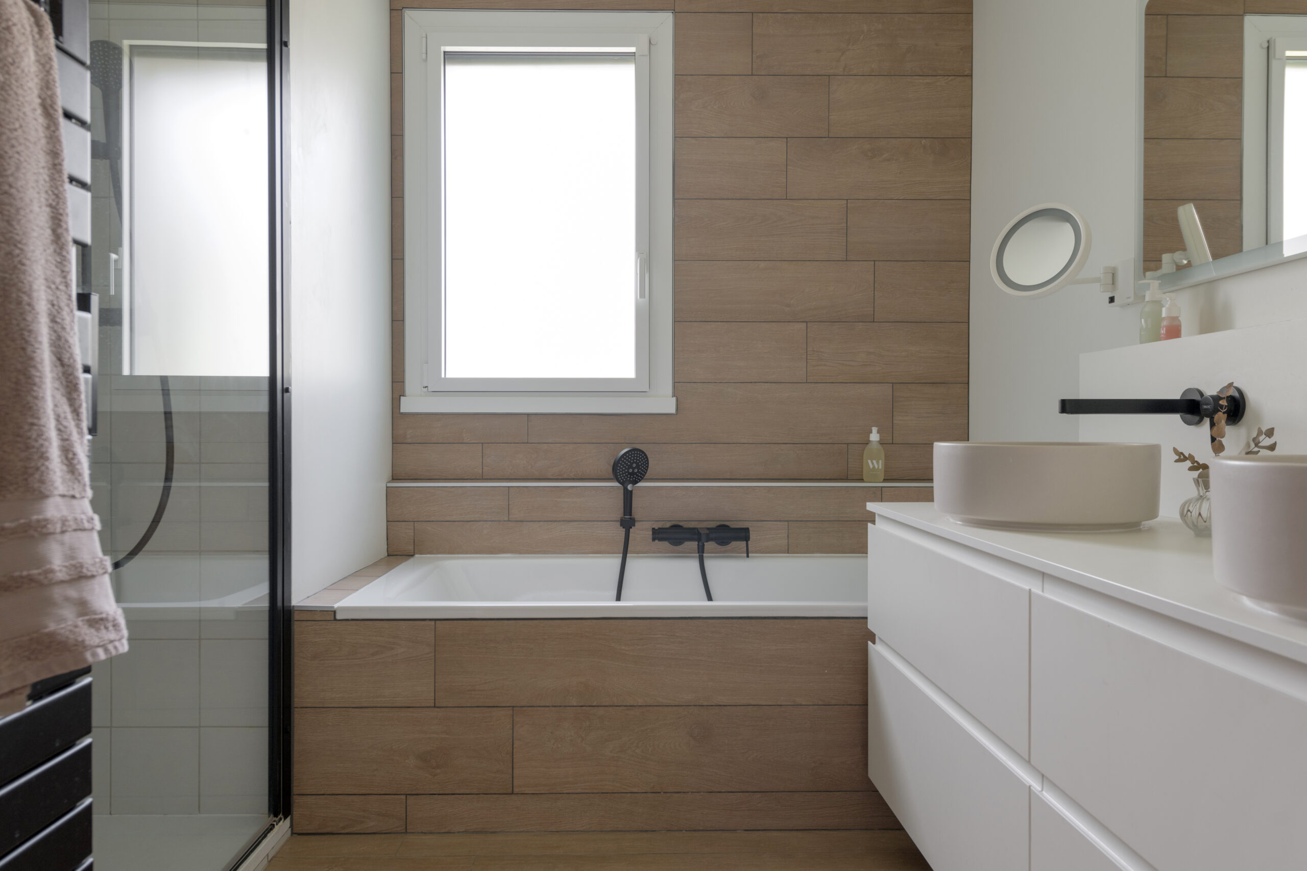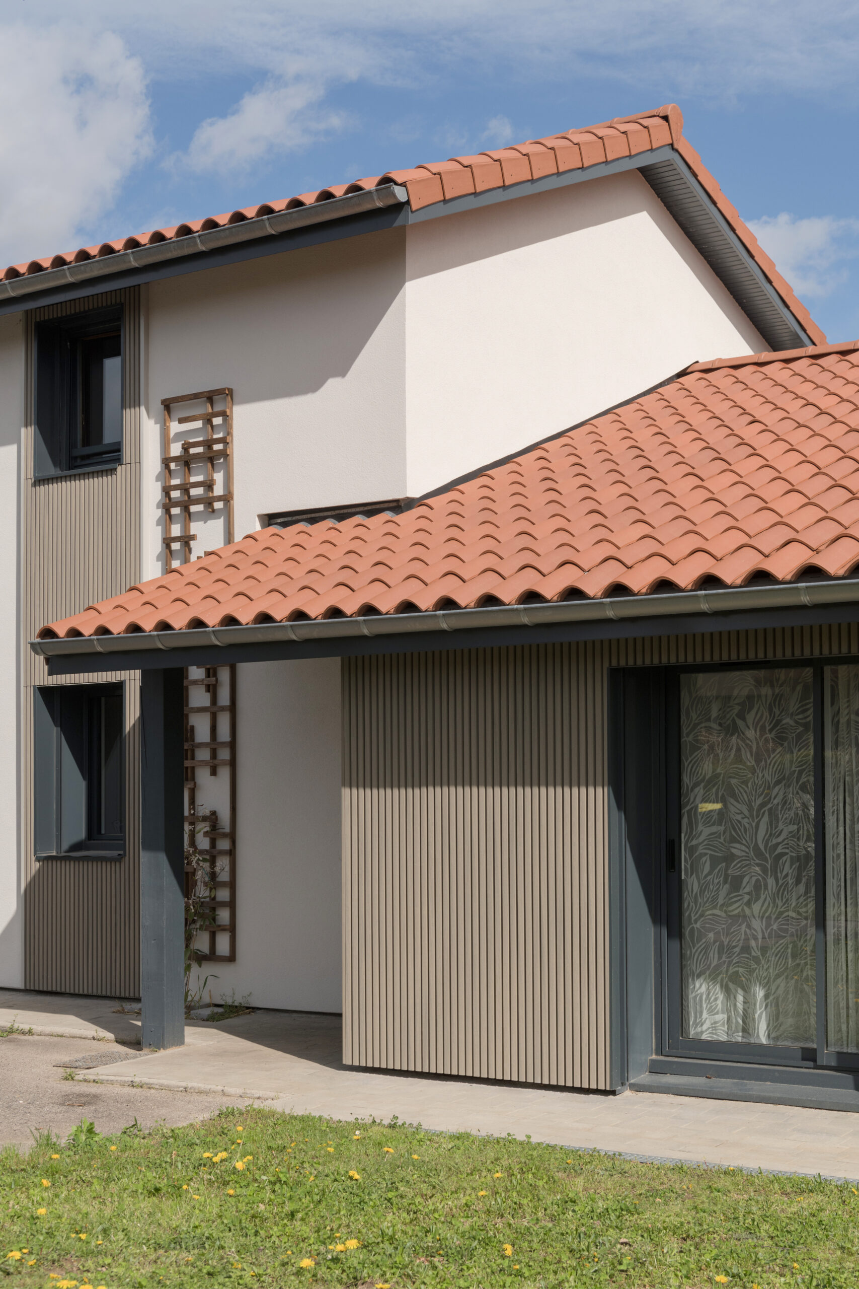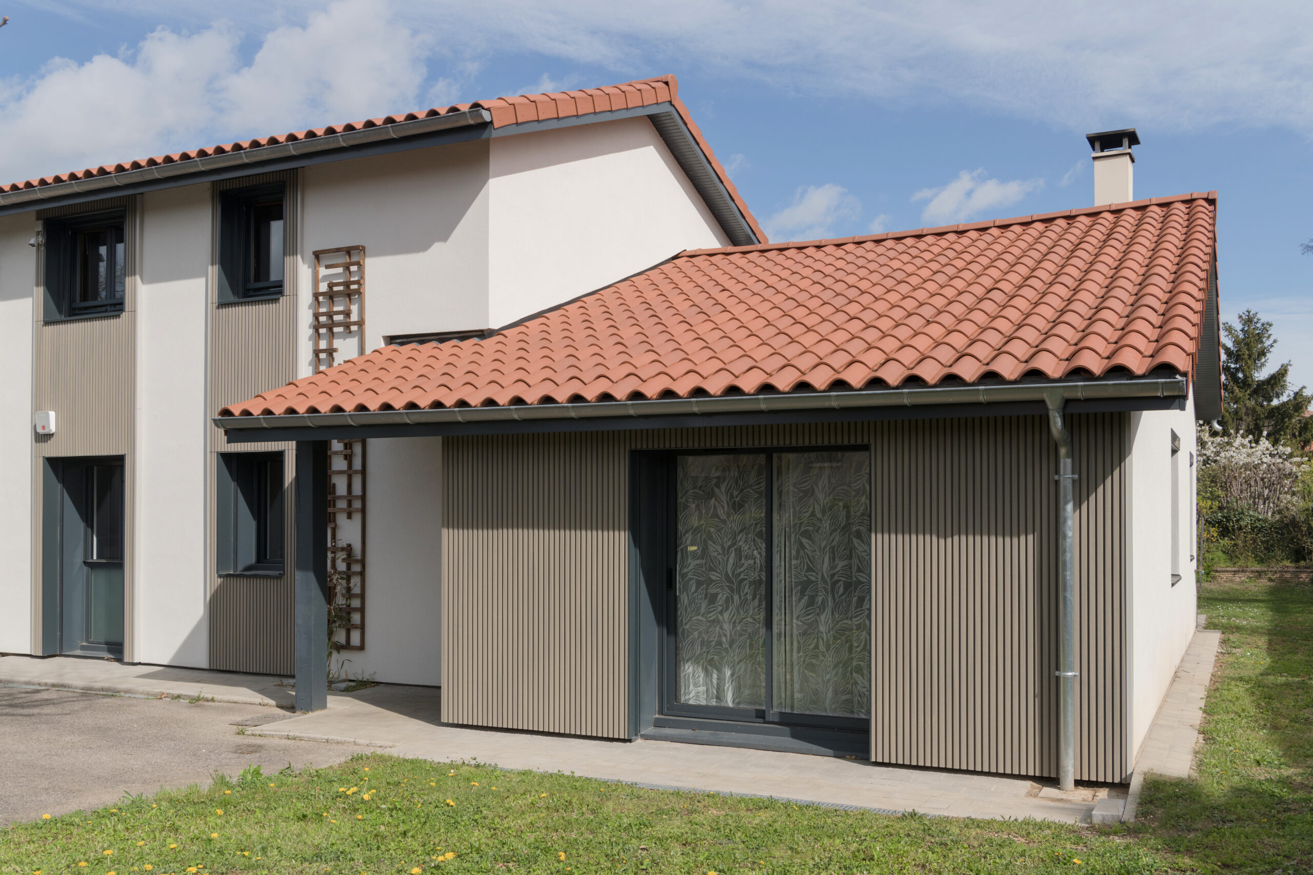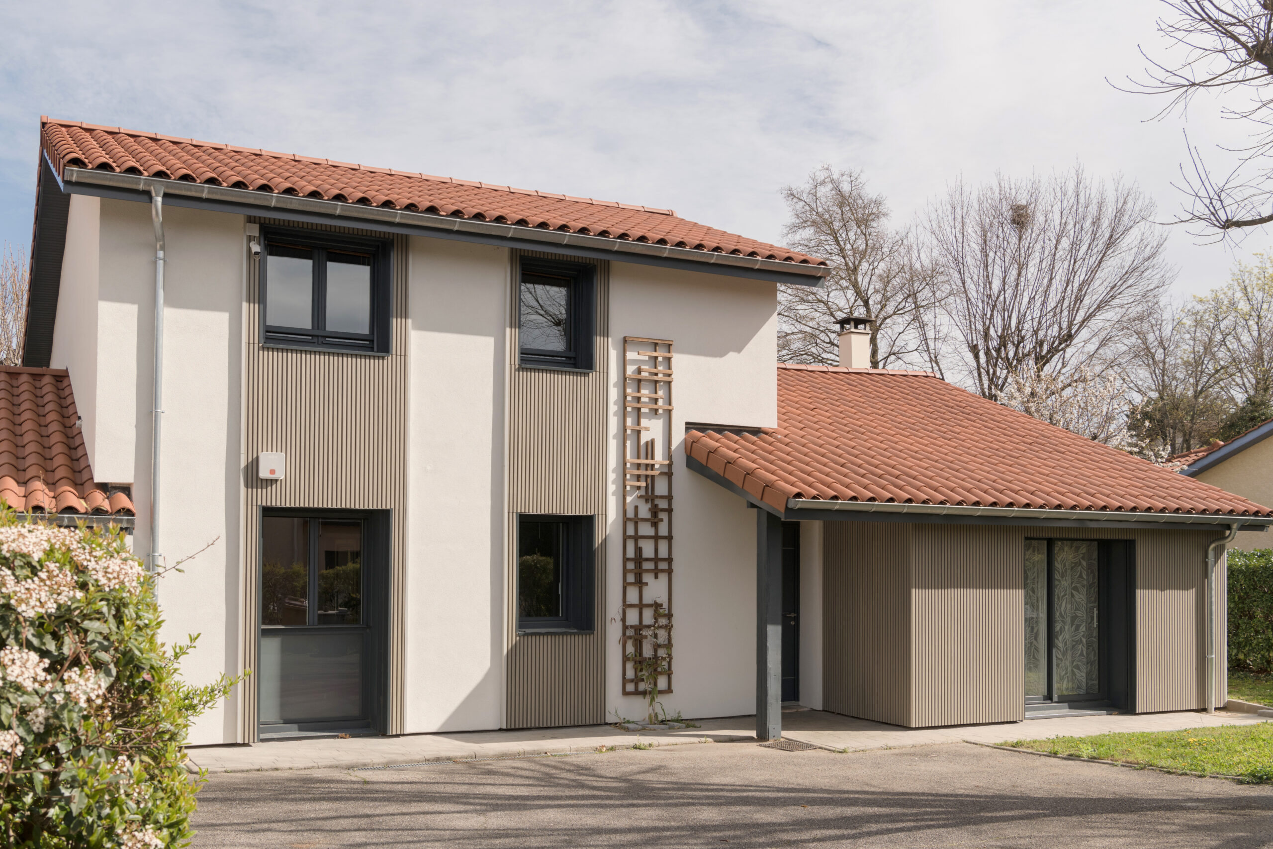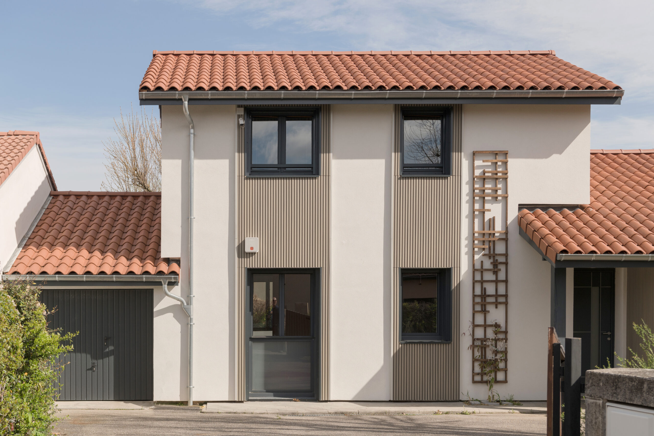 L’intégralité des façades a été isolée par l’extérieur avec de la laine de roche, afin d’améliorer significativement la performance énergétique de la maison. Cette isolation a permis de moderniser les façades en y intégrant du bardage bois et des éléments décoratifs végétaux. Plusieurs menuiseries ont également été remplacées en y intégrant des volets roulants, dont le coffre est masqué par le bardage.