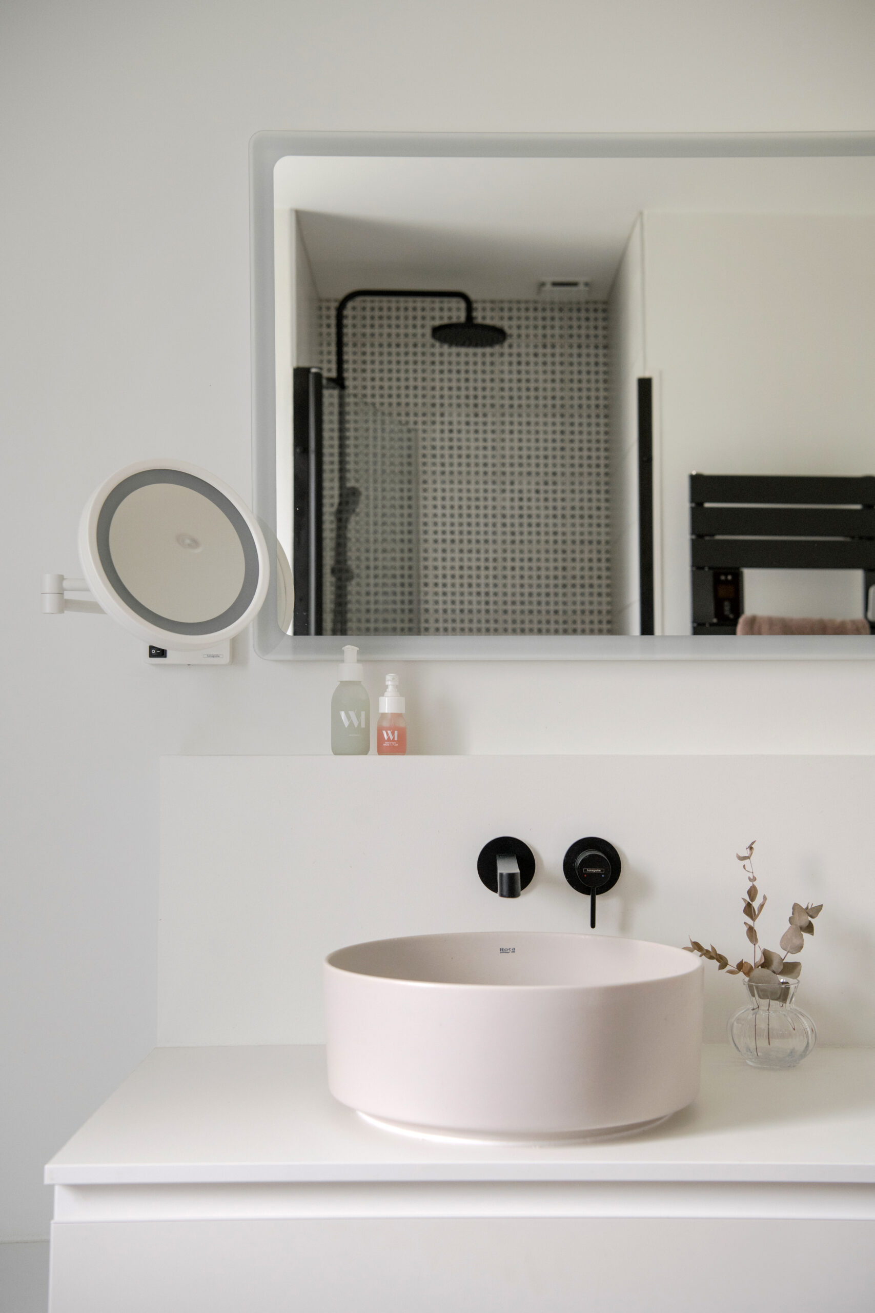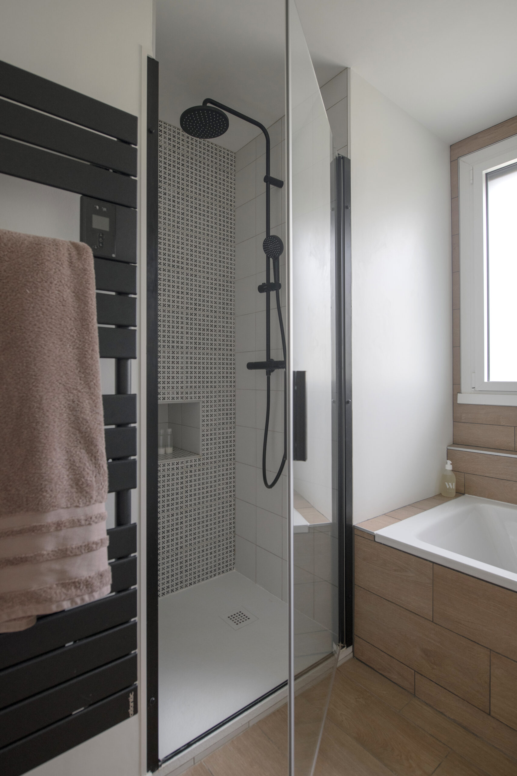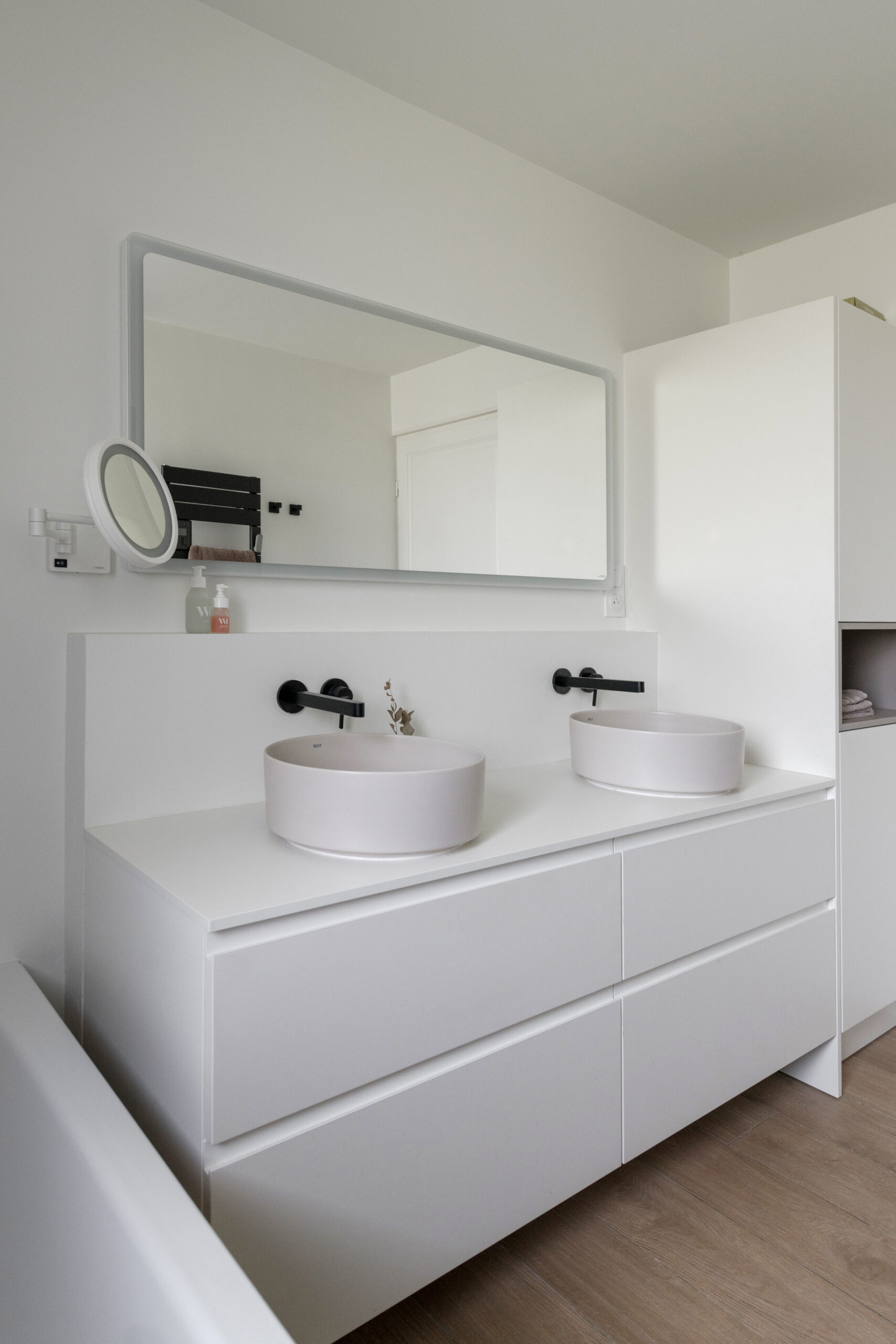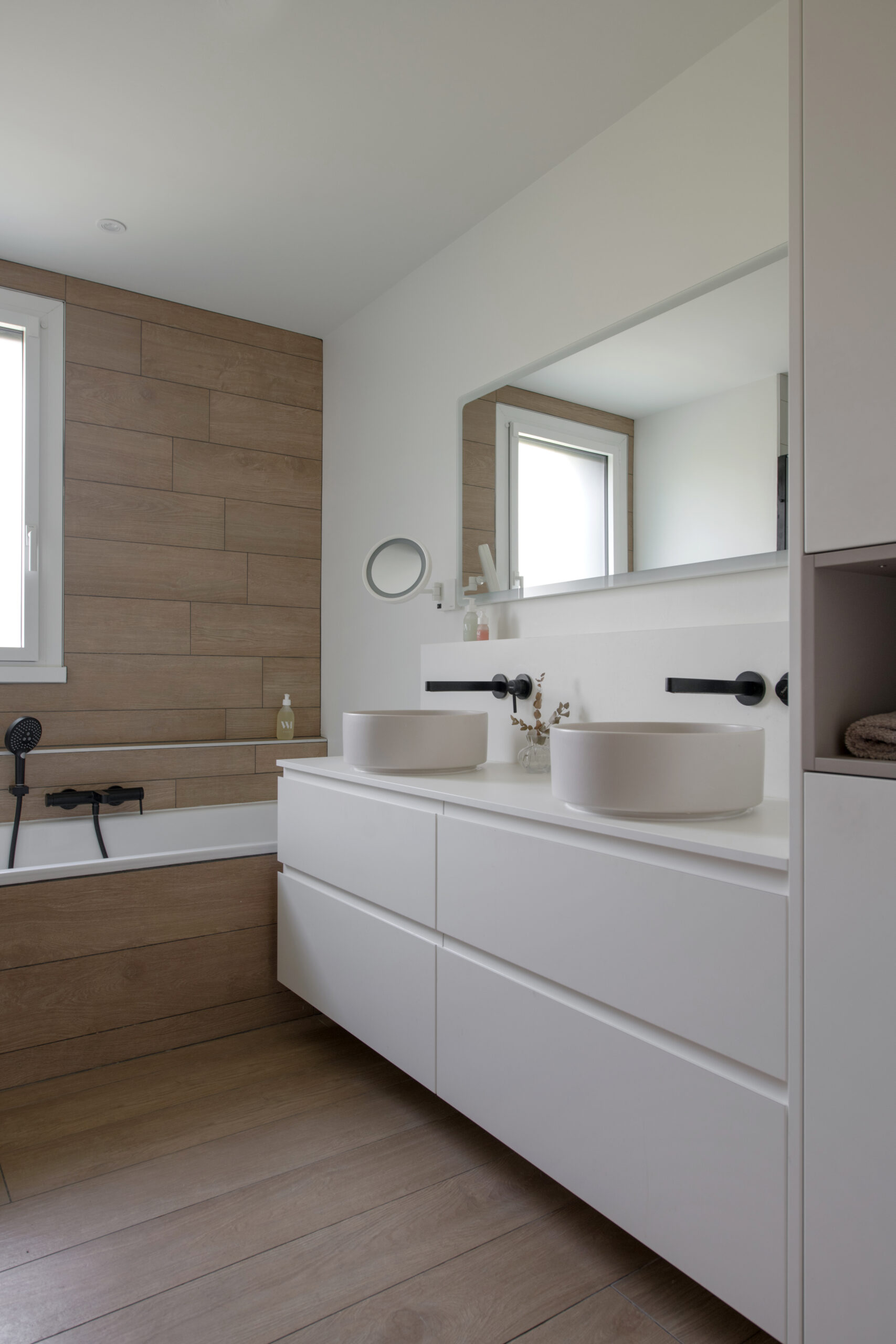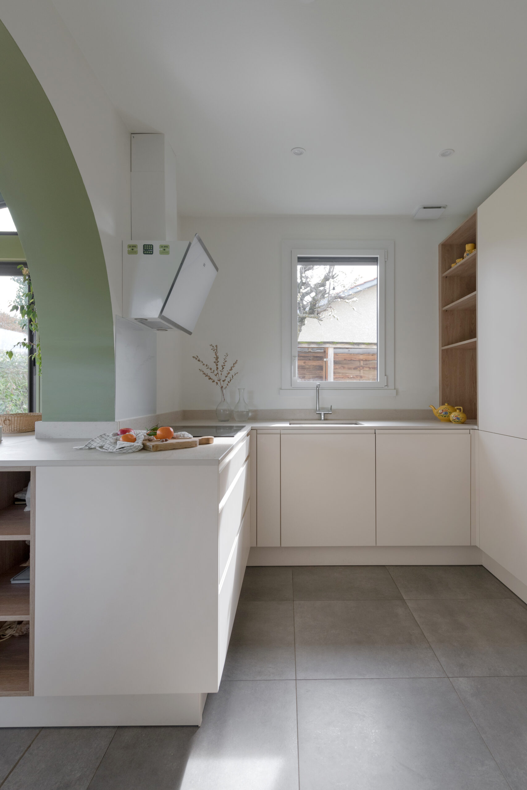 Une très grande partie des meubles a été réalisée sur mesure : cuisine, meuble de salle de bain et bibliothèque.