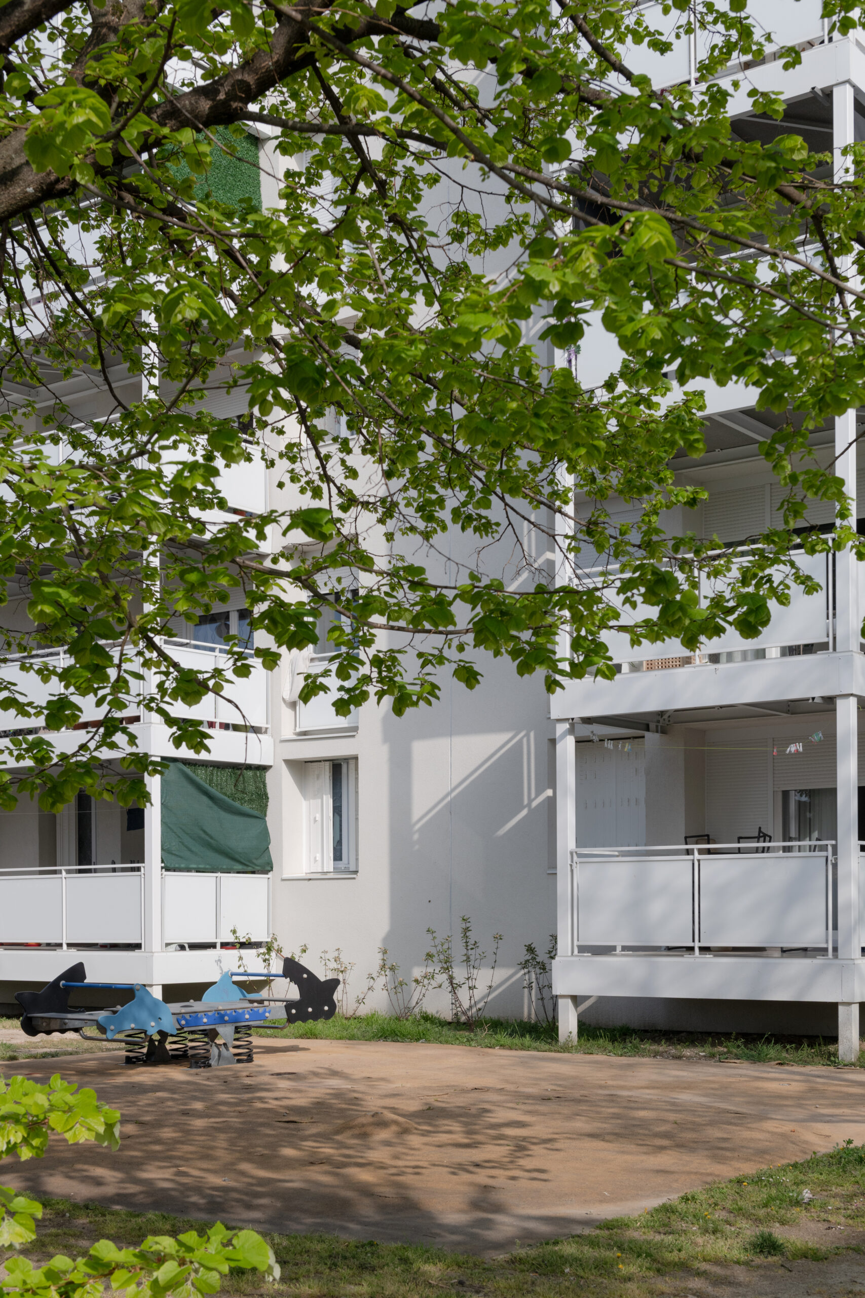 Ces bâtiments disposent également d’un niveau de sous-sol. La résidence, située à l’entrée Est du quartier, donnedirectement sur la rue de la Poudrette. Un petit parc, des places de parking en surface et des boxs relient les 2 bâtiments.