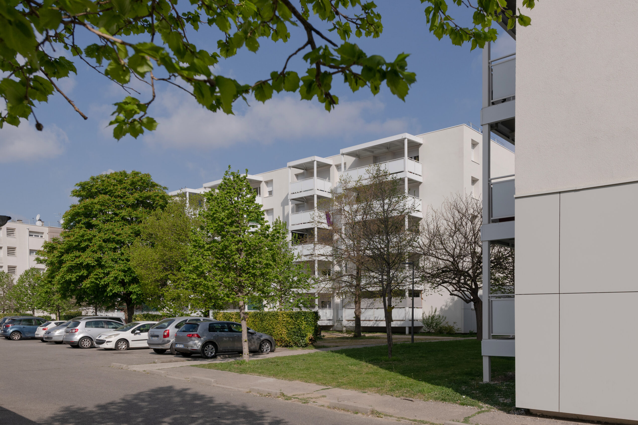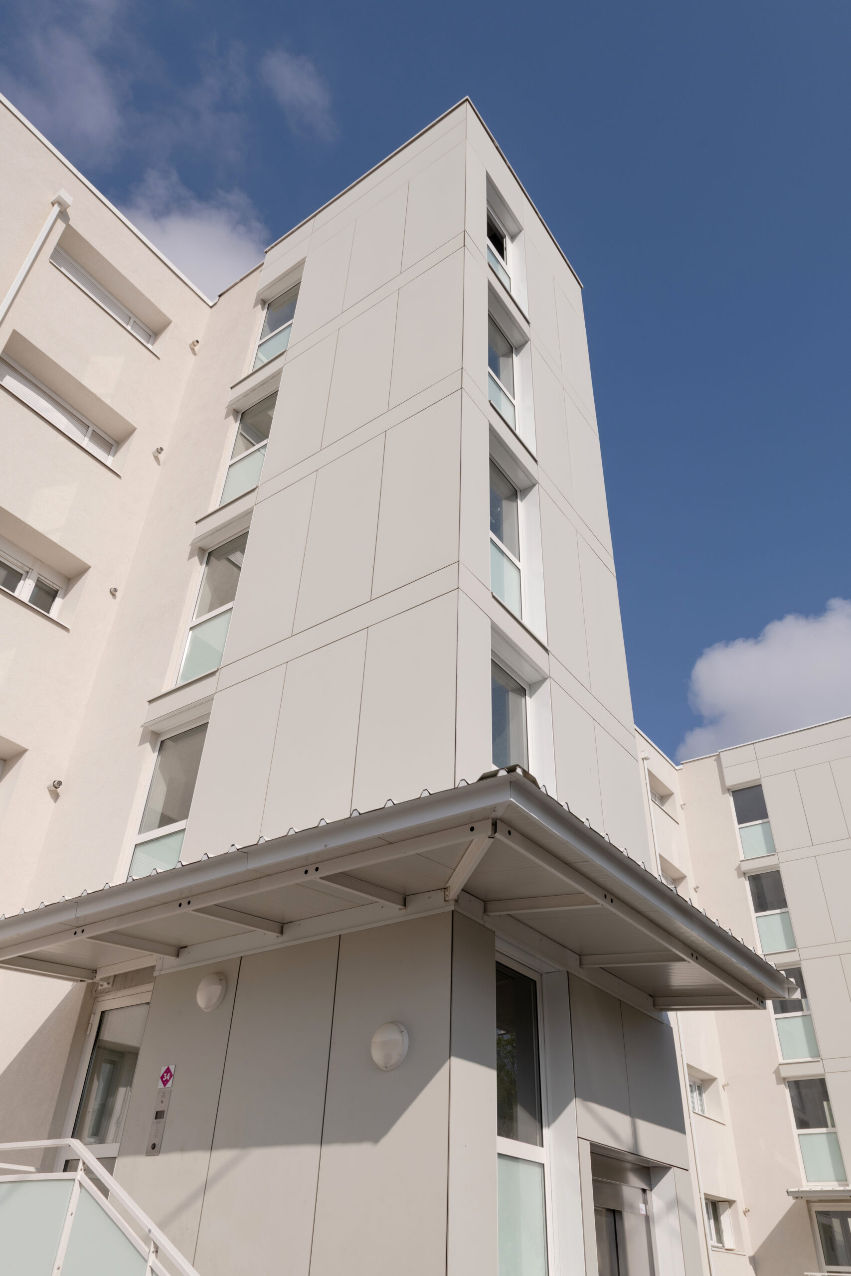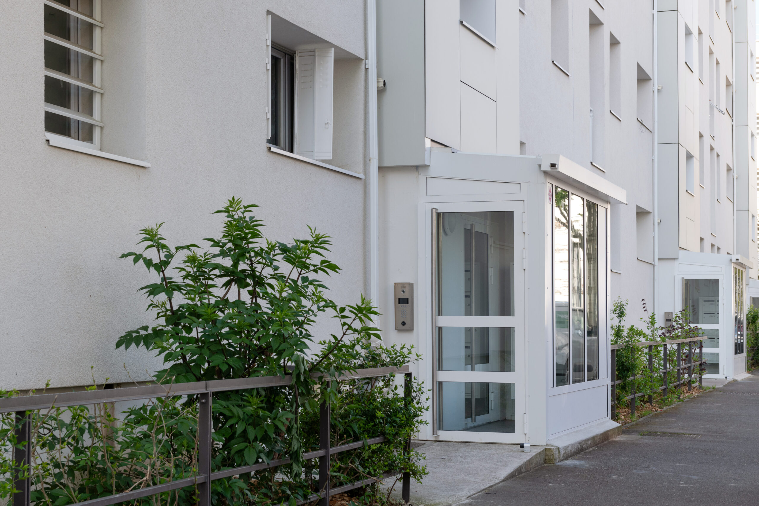 Ces bâtiments disposent également d’un niveau de sous-sol. La résidence, située à l’entrée Est du quartier, donne directement sur la rue de la Poudrette. Un petit parc, des places de parking en surface et des boxes relient les 2 bâtiments.
