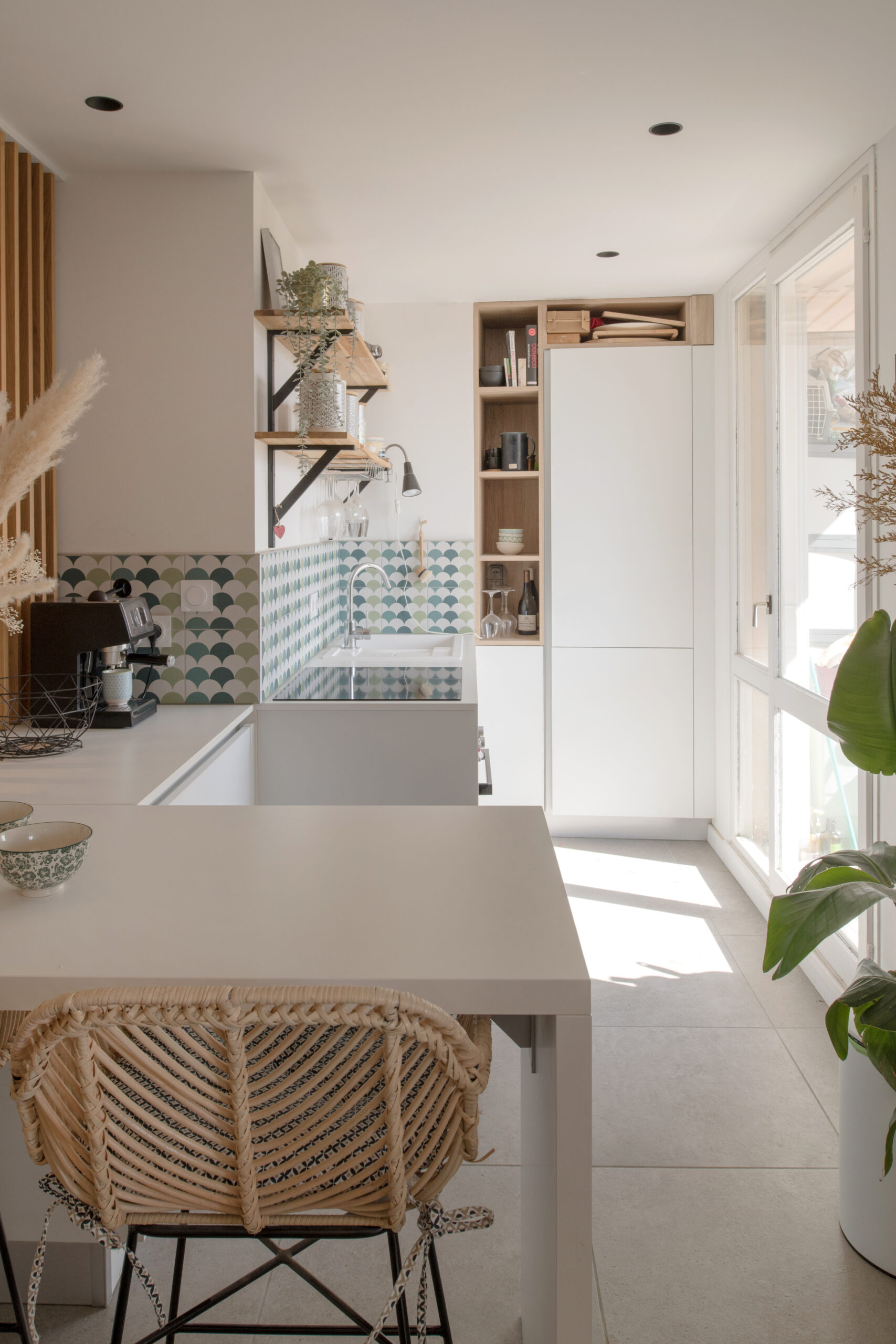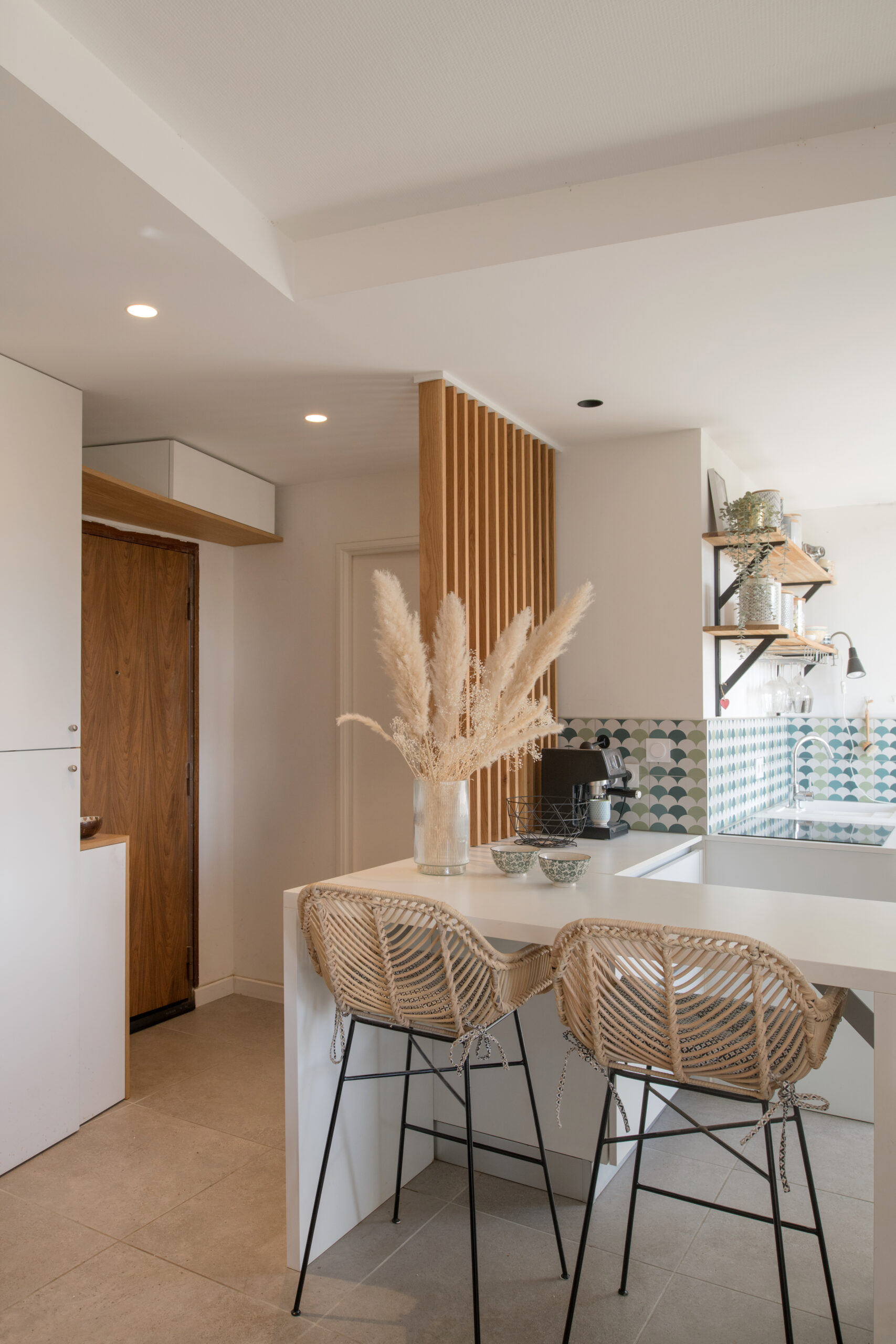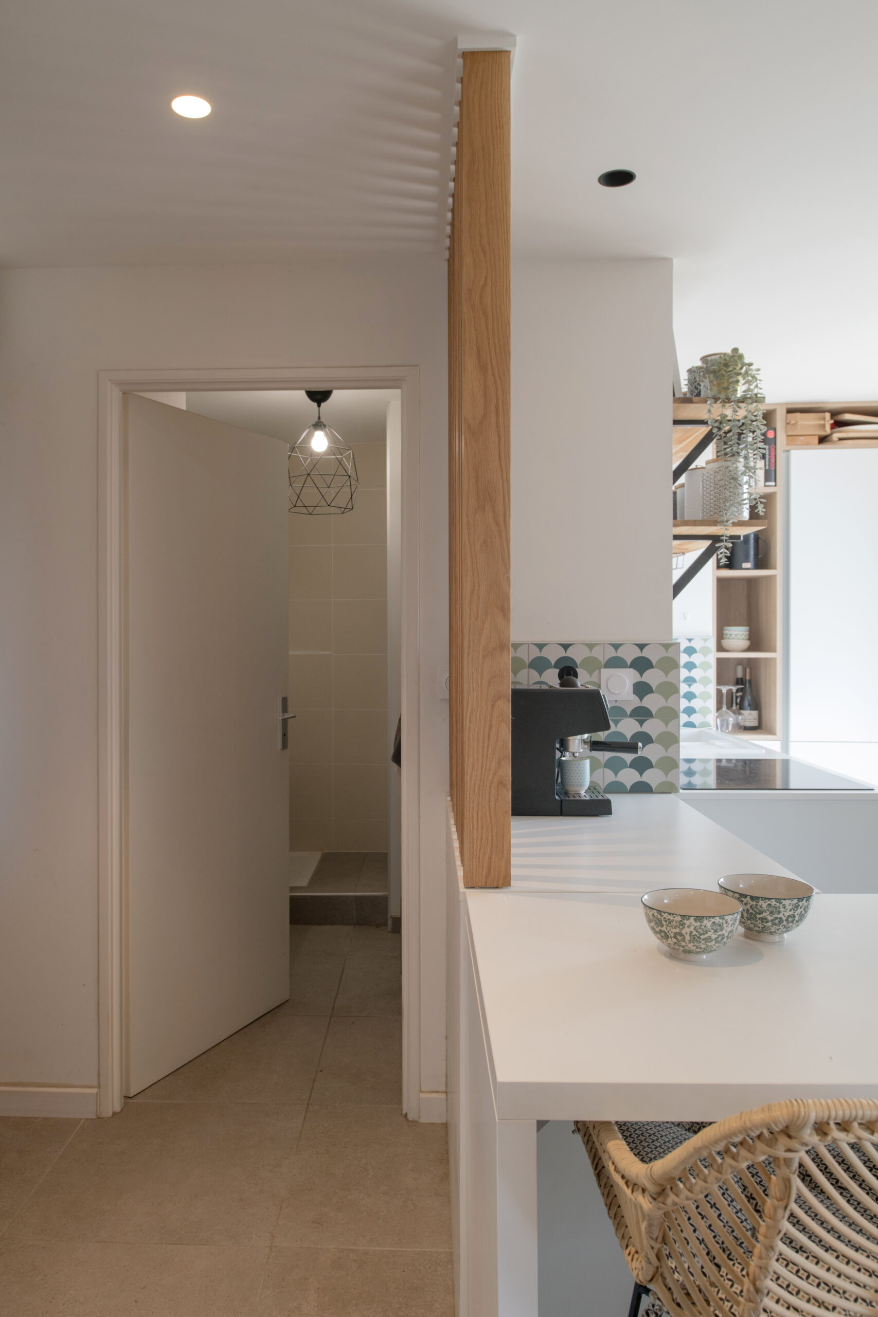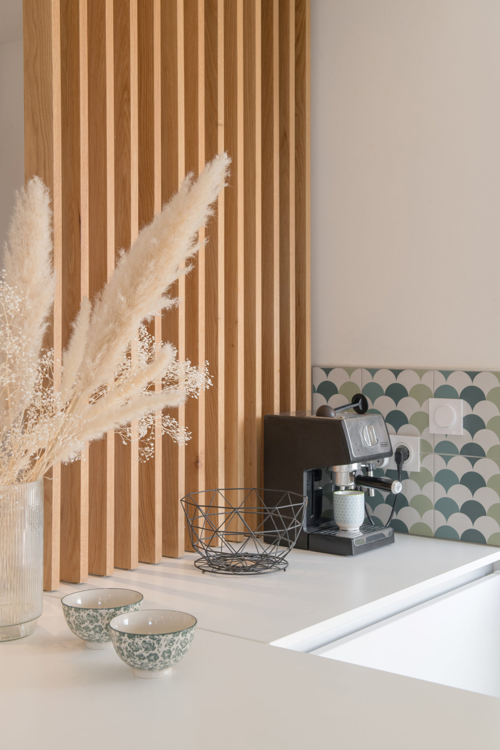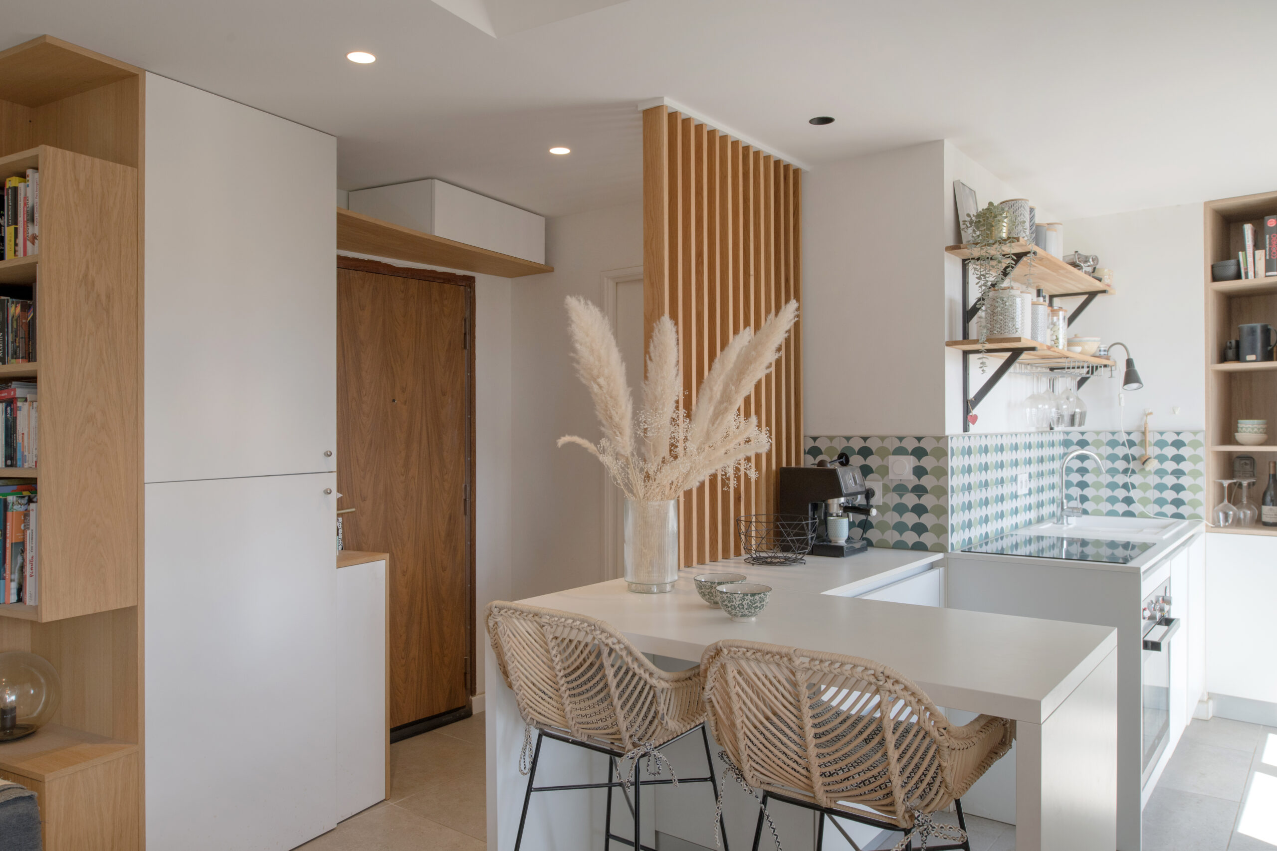 L’entrée est délimité par un meuble sur-mesure, incluant de nombreux rangements et séparée de la cuisine par un claustra en lames de bois. La cuisine sur-mesure, laquée blanche et bois clair vient s’accorder avec le meuble de l’entrée, afin d’apporter une unité visuelle.