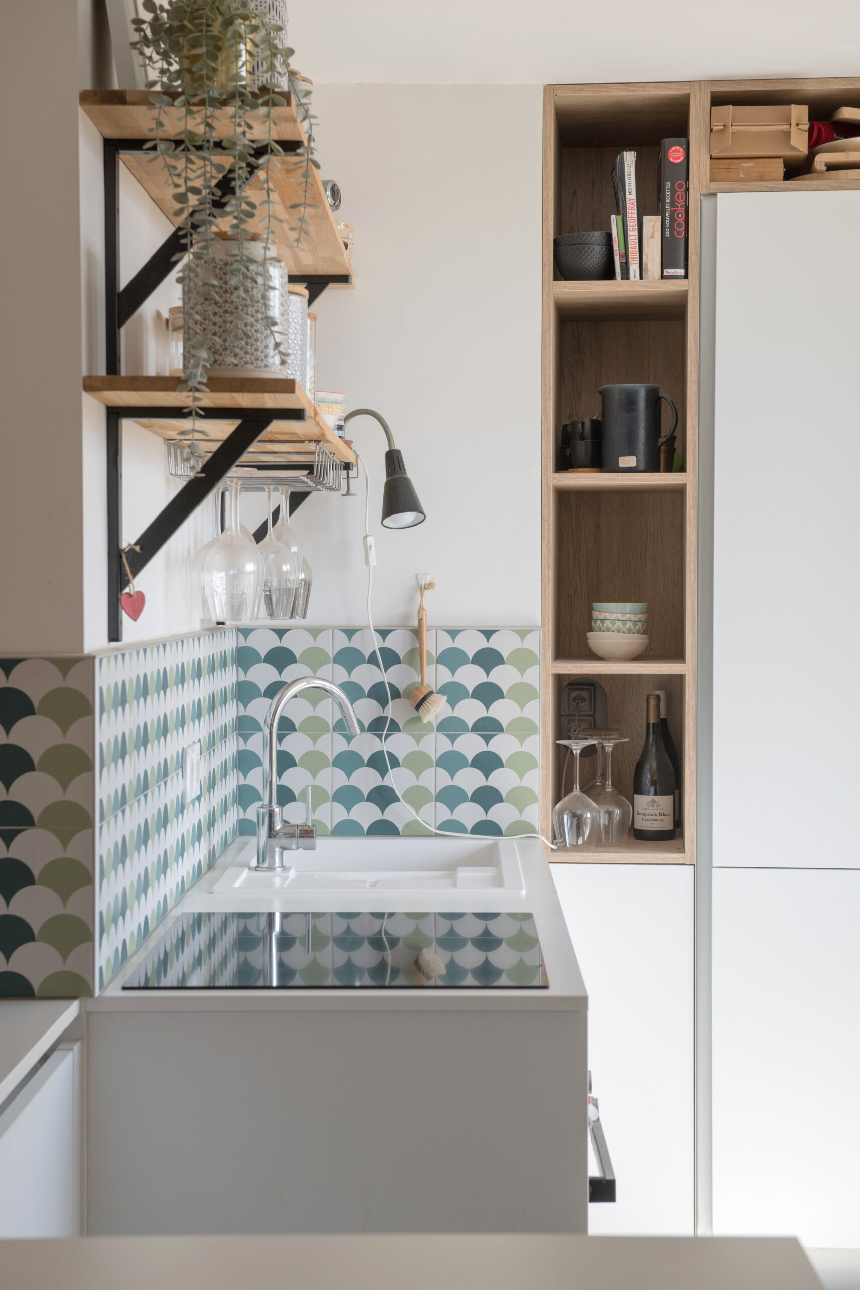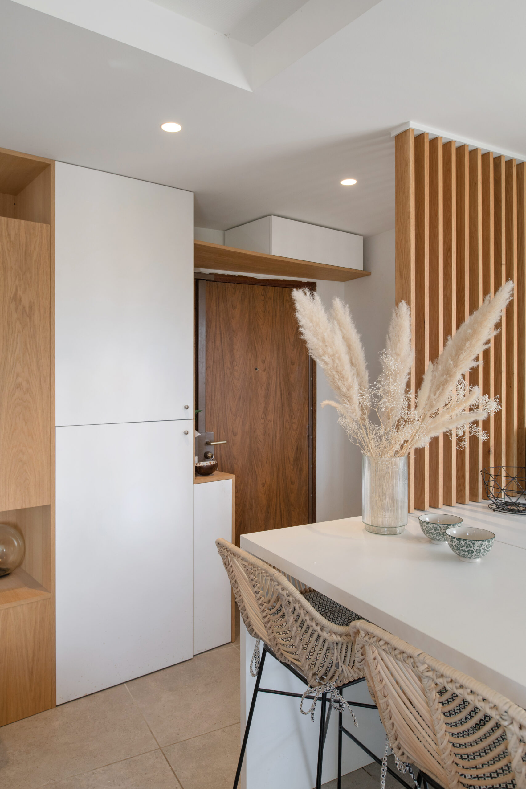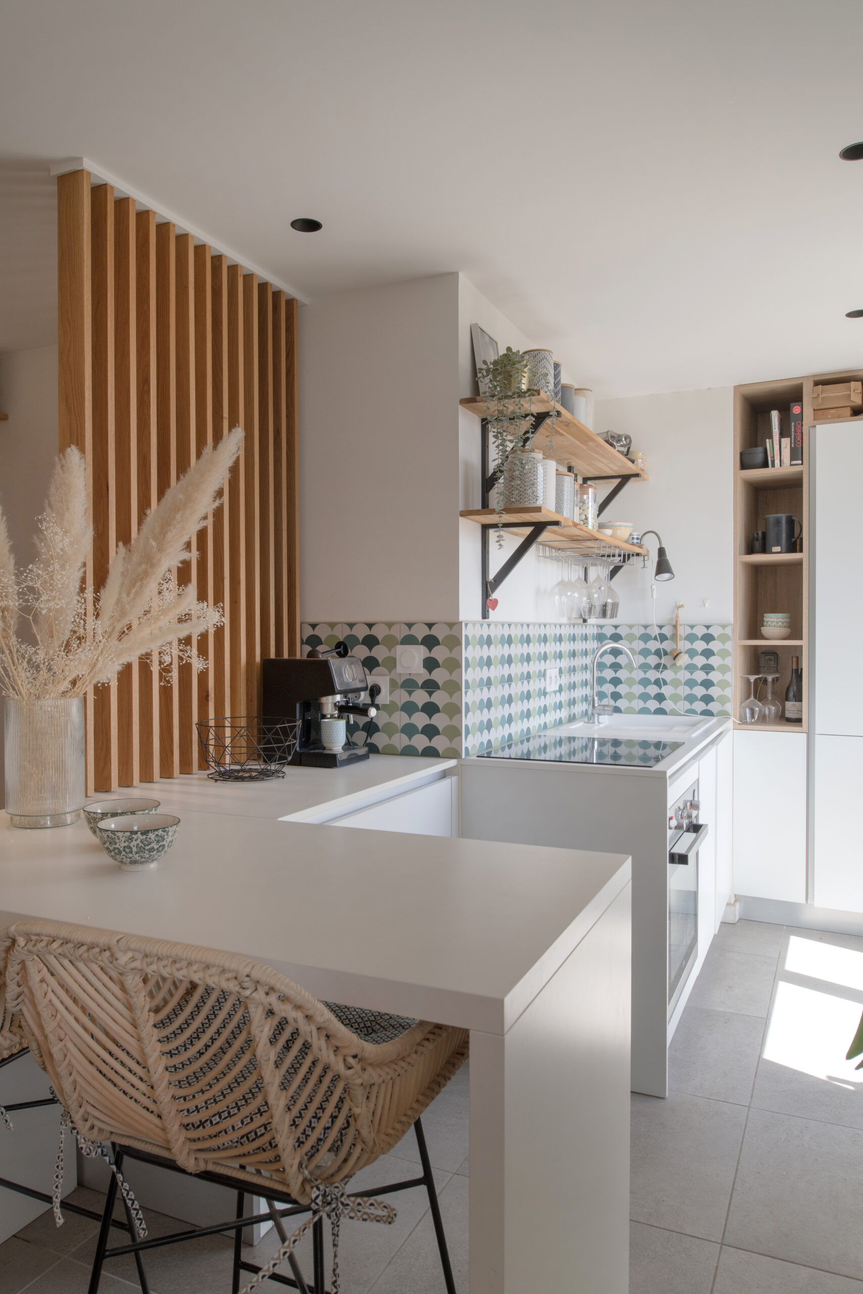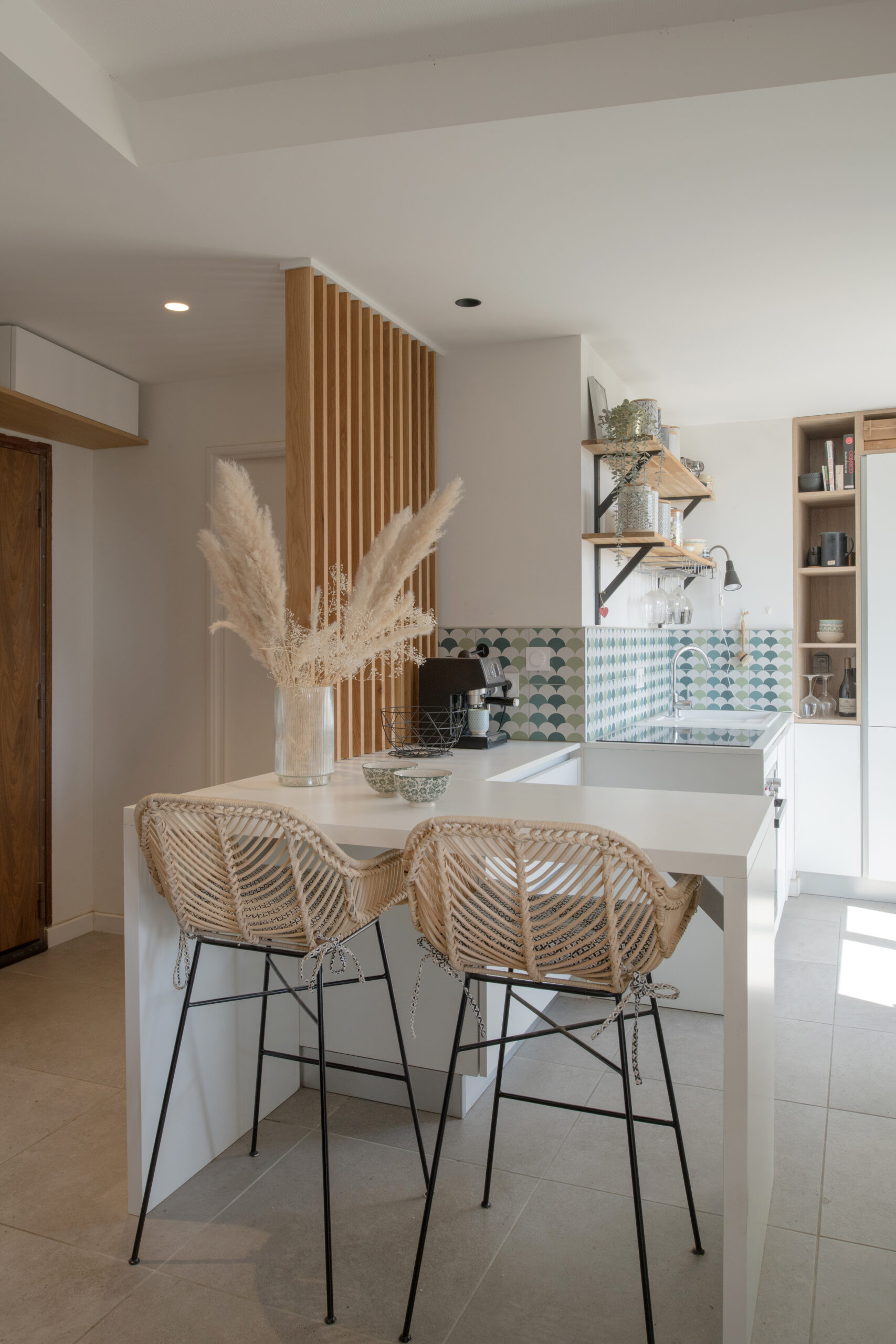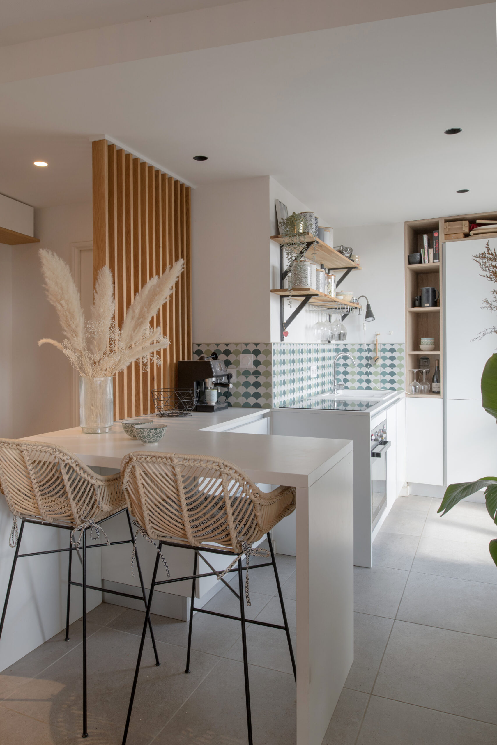 L’entrée est délimité par un meuble sur-mesure, incluant de nombreux rangements et séparée de la cuisine par un claustra en lames de bois. La cuisine sur-mesure, laquée blanche et bois clair vient s’accorder avec le meuble de l’entrée, afin d’apporter une unité visuelle.