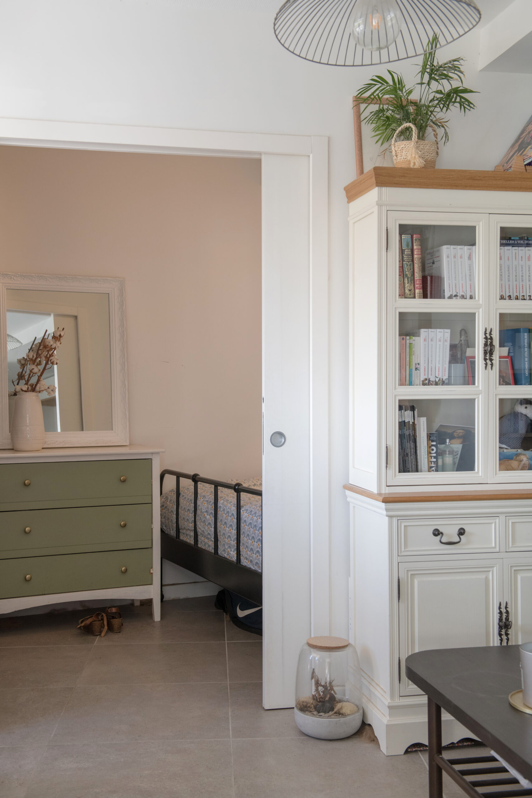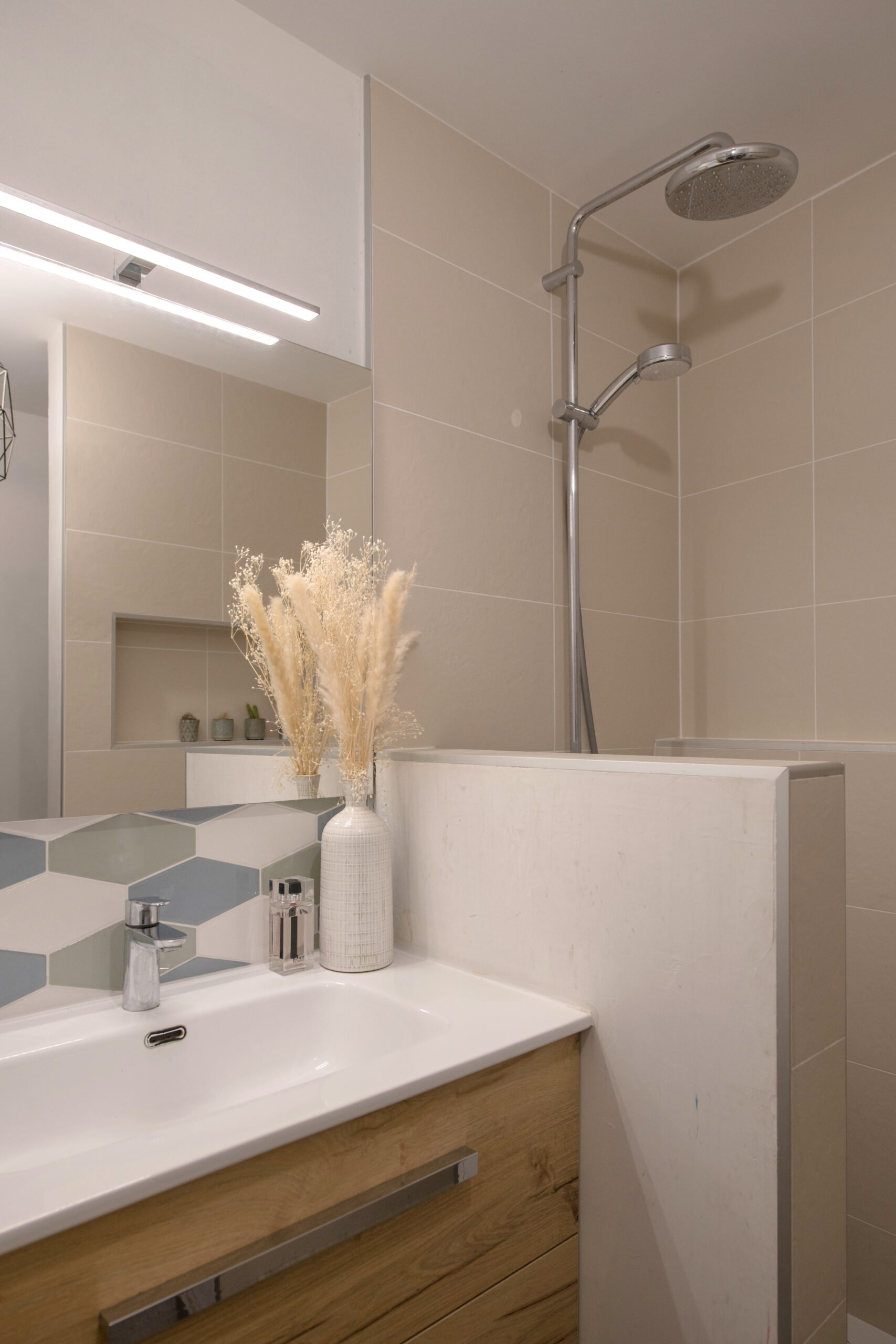 La salle de bain, est elle aussi, repensée : Les équipements sanitaires sont changés et une douche remplace l’ancienne baignoire, le tout baigné dans une gamme de couleurs claires et naturelles.